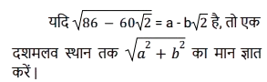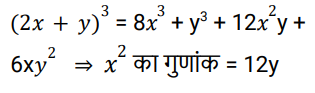 बीजगणित (SSC)Total Questions: 5041. यदि a + b + c + d = 2, तो (1 + a)(1 + b)(1 + c)(1 + d) का अधिकतम मान _____ है। [SSC CHSL 18/03/2020 (Afternoon)](a) 91/9(b) 81/16(c) 63/22(d) 54/13Correct Answer: (b) 81/16Solution:42. (2x + y)³ में x² का गुणांक क्या है ? [SSC CGL 05/03/2020 (Evening)](a) 12y²(b) 12(c) 12y(d) 8Correct Answer: (c) 12ySolution:43. दिए गए प्रश्न का उत्तर ज्ञात कीजिए ? [SSC CGL 03/03/2020 (Morning)](a) 3(b) 3ac(c) 3bc(d) 3abCorrect Answer: (a) 3Solution:44. यदि x = 5.51, y = 5.52 और z = 5.57, तो 𝑥³ + y³ + z³ - 3xyz का मान क्या है? [SSC CPO 11/12/2019 (Evening)](a) 5.146(b) 51.46(c) 0.05146(d) 0.5146Correct Answer: (c) 0.05146Solution:45. दिए गए प्रश्न का उत्तर ज्ञात कीजिए ? [SSC CPO 09/12/2019 (Evening)](a) 4.1(b) 4.2(c) 1.2(d) 3.7Correct Answer: (d) 3.7Solution:46. यदि (2x + 3y + 4)(2x + 3y - 5) ,(ax² + by² + 2hxy + 2gx + 2fy + c ), के समतुल्य है, तो {(g + f - c )/abh} का मान क्या होगा ? [SSC CPO 09/12/2019 (Morning)](a) 35/432(b) 19/108(c) 19/316(d) 37/216Correct Answer: (a) 35/432Solution:47. (4𝓍³y - 6𝓍²y² + 4xy³ - y⁴) को इस प्रकार अभिव्यक्त किया जा सकता है : [SSC CPO 09/12/2019 (Morning)](a)(b)(c)(d)Correct Answer: (d)Solution:48. दिए गए प्रश्न का उत्तर ज्ञात कीजिए ? [SSC CGL TIER II (13/09/2019)](a)(b)(c)(d)Correct Answer: (a)Solution:49. दिए गए प्रश्न का उत्तर ज्ञात कीजिए ? [SSC CGL TIER II (11/09/2019)](a) 8.4(b) 8.2(c) 7.8(d) 7.2Correct Answer: (c) 7.8Solution:50. दिए गए प्रश्न का उत्तर ज्ञात कीजिए ? [SSC CHSL 11/07/2019 (Evening)](a) 27/31(b) 27/32(c) 29/33(d) 29/31Correct Answer: (a) 27/31Solution:Submit Quiz« Previous12345