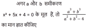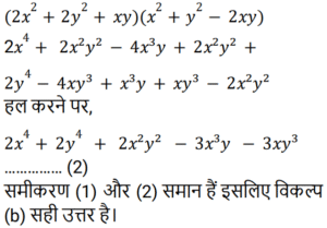बीजगणित Part-6Total Questions: 501. यदि किसी संख्या और उसके व्युल्कम का योग 7 है, तो नीचे दिए गए विकल्पों में से कौन सी संख्या ऐसी संख्या हो सकती है? [Group D 11/10/2022 ( Morning )](a)(b)(c)(d)Correct Answer: (a)Solution:2. यदि दो संख्याओं का योग 25 है और गुणनफल 136 है, तो उनके घनों का योग है: [Group D 11/10/2022 ( Morning )](a) 4524(b) 4525(c) 5524(d) 5425Correct Answer: (d) 5425Solution:3. निम्नलिखित को सरल कीजिए। [Group D 11/10/2022 ( Morning )](a) 0(b) (y²x)(c) 1(d) (y²x)⁻¹⁶Correct Answer: (c) 1Solution:4. दिए गए व्यंजक को सरल कीजिए। [Group D 11/10/2022 ( Afternoon )](a) (x² + y² − xy)(2x² + 2y² − xy)(b) (2x² + 2y² + xy)(x² + y² − 2xy)(c) (x² + y² − xy)(2x² + 2y² + xy)(d) (2x² + 2y² − xy)(x² + y² − 2xy)Correct Answer: (b) (2x² + 2y² + xy)(x² + y² − 2xy)Solution:5. दिए गए व्यंजक को सरल कीजिए। [Group D 11/10/2022 ( Afternoon )](a) x − y − z(b) 0(c) x² + y² + z²(d) x + y + zCorrect Answer: (b) 0Solution:6. दिए गए प्रश्न का उत्तर ज्ञात कीजिए ? [Group D 11/10/2022 ( Afternoon )](a) −6(b) −5(c) −4(d) −7Correct Answer: (b) −5Solution:7. दिए गए व्यंजक को सरल कीजिए। [Group D 11/10/2022 ( Afternoon )](a)(b)(c)(d)Correct Answer: (d)Solution:8. द्विघात समीकरण 𝑥² − 6𝑥 + 5 = 0 के मूल हैं [Group D 11/10/2022 ( Evening ) ](a) 5, 1(b) −5, −1(c) −3, −2(d) 3, 2Correct Answer: (a) 5, 1Solution:9. निम्नलिखित को सरल कीजिए [Group D 11/10/2022 ( Evening )](a) 81x¹⁴ / 36(b) 27x¹⁴ / 4(c) 81x⁶ / 36(d) 27x⁶ / 36Correct Answer: (b) 27x¹⁴ / 4Solution:10. यदि y = ∛6 − 4, तो y³ + 12y² + 48y + 100 का मान ज्ञात कीजिये ? [Level 6 (09/05/2022) Shift 1](a) 42(b) 0(c) 106(d) 6Correct Answer: (a) 42Solution:Submit Quiz12345Next »