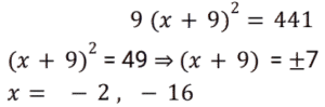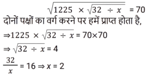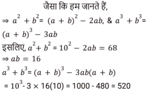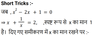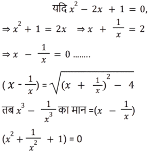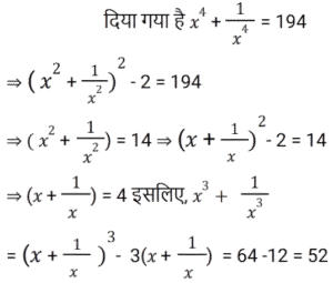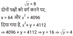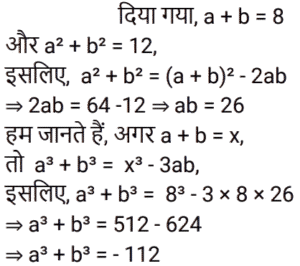 बीजगणित Part-6Total Questions: 5021. समीकरण 9(x + 9)² = 441 के मूल (roots) ज्ञात कीजिए। [Level 3 (17/06/2022) Shift 3](a) 2, 16(b) 12, 21(c) −12, −21(d) −2, −16Correct Answer: (d) −2, −16Solution:22. यदि a³ − b³ = 625, a² − b² = 25 है और a + b = 5 है तो a² + ab + b² का मान ज्ञात कीजिये? [RRB NTPC 28/12/2020 (Morning)](a) 125(b) 25(c) 5(d) 150Correct Answer: (a) 125Solution:23. यदि x समीकरण x² − 2x + 1 = 0 को संतुष्ट करता है, तो x³ − 1/x³ का मान है ? [RRB NTPC 28/12/2020 (Evening)](a) 1(b) −1(c) 1/3(d) 0Correct Answer: (d) 0Solution:24. यदि a + b = 8 और a² + b² = 12, तो a³ + b³ का मान क्या होगा ? [RRB NTPC 29/12/2020 (Evening)](a) 1136(b) −211(c) 716(d) −112Correct Answer: (d) −112Solution:25. निम्नलिखित को हल कीजिये। (x − y)³ + (y − z)³ + (z − x)³ = ? [RRB NTPC 30/12/2020 (Morning)](a) 3(x − y)(y − z)(z − x)(b) (x − y)(y − z)(z − y)(c) (x + y + z)(x² + y² + z²)(d) 3xyzCorrect Answer: (a) 3(x − y)(y − z)(z − x)Solution:26. यदि √1225 × √32 ÷ x = 70 तो x का मान ज्ञात कीजिए ? [RRB NTPC 30/12/2020 (Evening)](a) 8(b) 2(c) 16(d) 4Correct Answer: (b) 2Solution:27. यदि x⁴ + 1/x⁴ = 194 तो x³ + 1/x³ का मान ज्ञात कीजिये ? [RRB NTPC 30/12/2020 (Evening)](a) 56(b) 52(c) 54(d) 62Correct Answer: (b) 52Solution:28. यदि a + b = 10 और a² + b² = 68, तो a³ + b³ ज्ञात कीजिये ? [RRB NTPC 30/12/2020 (Evening)](a) 520(b) 560(c) 620(d) 540Correct Answer: (a) 520Solution:29. यदि x²y² + 1/(x²y²) = 83 है, तो xy − 1/(xy) का मान ज्ञात कीजिये ? [RRB NTPC 04/01/2021 (Morning)](a) 10(b) 9(c) 85(d) 81Correct Answer: (b) 9Solution:30. यदि x और y दो धनात्मक संख्याएँ हैं इस प्रकार कि √x = 8 और x² + y = 4112, तो √y का मान ज्ञात कीजिए। [RRB NTPC 04/01/2021 (Evening)](a) 6(b) 16(c) 2(d) 4Correct Answer: (d) 4Solution:Submit Quiz« Previous12345Next »
