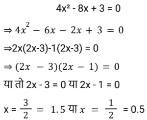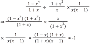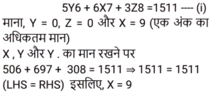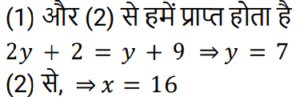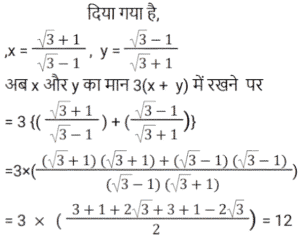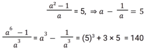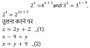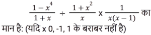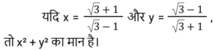 बीजगणित Part-8Total Questions: 5041. यदि 4x² − 8x + 3 = 0, तो x के संभावित मान क्या हैं? [RRB NTPC 12/03/2021 (Morning)](a) 1.5, 0.5 (b) 2.5, 1.5(c) 2, 1.5 (d) 0.2, 0.5Correct Answer: (a) 1.5, 0.5 Solution:42. यदि (a² − 1)/a = 5, तो (a⁶ − 1)/a³ = ? [RRB NTPC 12/03/2021 (Morning)](a) 120 (b) 140(c) 125 (d) 130Correct Answer: (b) 140Solution:43. अगर 2ˣ = 4ʸ⁺¹ and 3ʸ = 3ˣ⁻⁹, तो x और y के मान होंगे: [RRB NTPC 13/03/2021 (Evening)](a) (−16, 7) (b) (16, −7)(c) (7, 16) (d) (16, 7)Correct Answer: (d) (16, 7)Solution:44. समीकरण 3(5x + 2) − 4 = 2(1 − 4x) में चर x का मान है: [RRB NTPC 13/03/2021 (Evening)](a) 10 (b) −1 (c) 2 (d) 0Correct Answer: (d) 0Solution:45. यदि x − y = 1, तो x³ − y³ − 3xy का मान होगा: [RRB NTPC 14/03/2021 (Morning)](a) −1 (b) 2 (c) 0 (d) 1Correct Answer: (d) 1Solution:46. दिए गए प्रश्न का उत्तर ज्ञात कीजिए ? [RRB NTPC 14/03/2021 (Morning)](a) −1 (b) 1 (c) 0 (d) 2Correct Answer: (a) −1 Solution:47. दिए गए प्रश्न का उत्तर ज्ञात कीजिए ? [RRB NTPC 14/03/2021 (Evening) ](a) 14 (b) 10 (c) 13 (d) 15Correct Answer: (a) 14 Solution:48. 3(x + y) का मान ज्ञात कीजिए यदि x = (√3 + 1)/(√3 − 1) और y = (√3 − 1)/(√3 + 1). [RRB NTPC 15/03/2021 (Morning)](a) 12 (b) 10 (c) 8 (d) 13Correct Answer: (a) 12 Solution:49. यदि a − 5 = b, तो |a − b| + |b − a| का मान क्या है? [RRB NTPC 15/03/2021 (Morning)](a) 10 (b) 5 (c) −5 (d) 0Correct Answer: (a) 10 Solution:50. दिए गए समीकरण में x का उच्चतम मान क्या होगा? 5Y6 + 6X7 + 3Z8 = 1511 [RRB NTPC 15/03/2021 (Morning)](a) 6 (b) 9(c) 7 (d) 5Correct Answer: (b) 9Solution:Submit Quiz« Previous12345