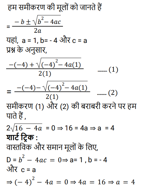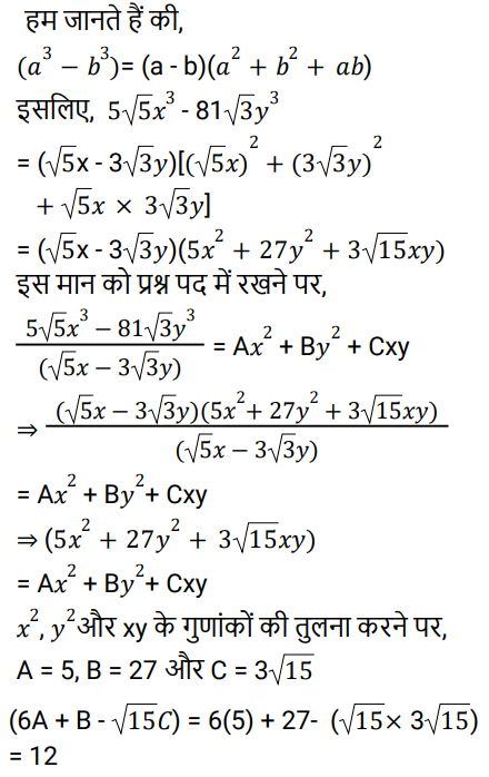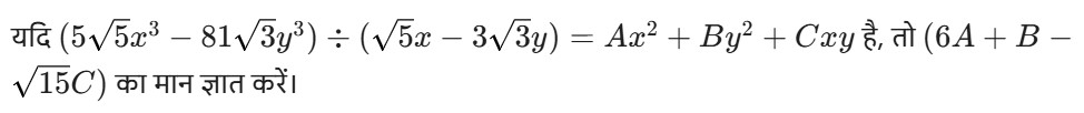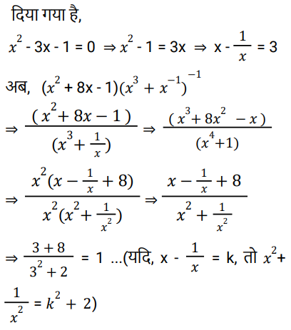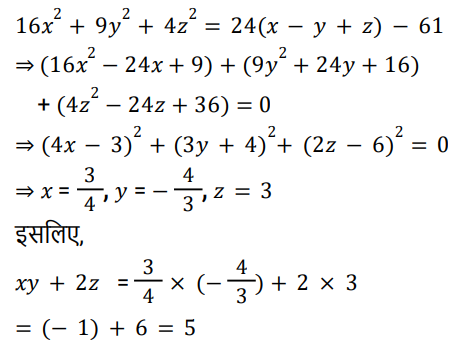 बीजगणित (SSC) (Part-II)Total Questions: 5011. यदि 𝓍² - 3x - 1 = 0 है, तो (𝓍² + 8x - 1) (𝓍³ + 𝓍⁻¹)⁻¹ का मान क्या होगा ? [SSC CGL 07/06/2019 (Afternoon)](a) 3/8(b) 8(c) 1(d) 3Correct Answer: (c) 1Solution:12. यदि x = 2 - p है, तो का 𝓍³ + 6𝓍p + p³ मान क्या होगा ? [SSC CGL 07/06/2019 (Morning)](a) 12(b) 6(c) 8(d) 4Correct Answer: (c) 8Solution:13. यदि 2𝓍² + y² + 6x - 2xy + 9 = 0 है, तो 4𝓍³ - y³ + 𝓍²y² का मान क्या होगा ? [SSC CGL 06/06/2019 (Afternoon)](a) 0(b) 9(c) - 3(d) - 9Correct Answer: (a) 0Solution:14. दिए गए प्रश्न का उत्तर ज्ञात कीजिए ? [SSC CGL 06/06/2019 (Morning)](a) 72(b) 56(c) 84(d) 80Correct Answer: (a) 72Solution:15. यदि x + y = 1 है और xy(xy - 2) = 12 है, तो 𝓍⁴ + y⁴ का मान क्या होगा ? [SSC CGL 04/06/2019 (Evening)](a) 19(b) 25(c) 20(d) 23Correct Answer: (b) 25Solution:16. यदि 16𝓍² + 9y² + 4z² = 24(x - y + z) - 61 है, तो (xy + 2z) का मान क्या होगा ? [SSC CGL 04/06/2019 (Afternoon)](a) 1(b) 2(c) 3(d) 5Correct Answer: (d) 5Solution:17. दिए गए प्रश्न का उत्तर ज्ञात कीजिए ? [SSC CGL 04/06/2019 (Morning)](a) 10(b) 9(c) 15(d) 12Correct Answer: (d) 12Solution:18. यदि x + y + z = 19, 𝓍² + y² + z² = 133 तथा xz = y² है, तो z और x के बीच क्या अंतर है ? [SSC CGL 04/06/2019 (Morning)](a) 5(b) 3(c) 6(d) 4Correct Answer: (a) 5Solution:19. यदि 𝓍⁴ + 𝓍⁻⁴ = 194, 𝓍 ≻ 0 है, तो (𝑥 − 2)² का मान क्या होगा ? [SSC CGL 04/06/2019 (Morning)](a) 1(b) 6(c) 2(d) 3Correct Answer: (d) 3Solution:20. यदि 𝓍² - 4x + a = 0 के मूल बराबर हैं, तो a = ? [SSC CPO 16/03/2019 (Evening)](a) - 4(b) 4(c) 8(d) -8Correct Answer: (b) 4Solution:Submit Quiz« Previous12345Next »
