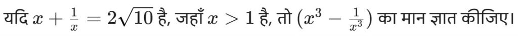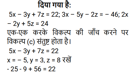 बीजगणित (SSC) (Part-II)Total Questions: 5031. दिए गए प्रश्न का उत्तर ज्ञात कीजिए ? [SSC CGL 11/09/2024 (1st Shift)](a) 221(b) 234(c) 198(d) 216Correct Answer: (b) 234Solution:32. अज्ञात मान प्राप्त करनेके लिए दिए गए तीन समीकरणोंके समूह को हल कीजिए: [SSC CGL 11/09/2024 (1st Shift)]x + 2z = 3 x + 2y + 3z = 5 3x - 5z = -13(a) x = 0,y = -1,z = 2(b) x = -1,y = 0,z = 2(c) x = -1,y = 2,z = 0(d) x = 2,y = 0,z = -1Correct Answer: (b) x = -1,y = 0,z = 2Solution:33. दिए गए प्रश्न का उत्तर ज्ञात कीजिए ? [SSC CGL 11/09/2024 (3rd Shift)](a) 87(b) 81(c) 77(d) 79Correct Answer: (d) 79Solution:34. दिए गए प्रश्न का उत्तर ज्ञात कीजिए ? [SSC CGL 12/09/2024 (1st Shift)](a) 1/5(b) 1(c) 2(d) 1/2Correct Answer: (b) 1Solution:35. दिए गए प्रश्न का उत्तर ज्ञात कीजिए ? [SSC CGL 12/09/2024 (1st Shift)](a) - 48/7(b) - 22/7(c) 48/7(d) 22/7Correct Answer: (c) 48/7Solution:36. निम्नलिखित समीकरणों के लिए a और b के मान क्या हैं, जिनके अपरिमित रूप से अनेक हल हों? [SSC CGL 12/09/2024 (2nd Shift)]ax + by = 2 3x - (5 - 2a)y = 6(a) a = - 1, b = - 1(b) a = - 1, b = 1(c) a = 1, b = - 1(d) a = 1, b = 1Correct Answer: (c) a = 1, b = - 1Solution:37. यदि m + n = 24 है, तो then (m -16)³ + (n - 8)³ का मान ________ है। [SSC CGL 12/09/2024 (2nd Shift)](a) 0(b) 40(c) 576(d) 320Correct Answer: (a) 0Solution:38. यदि समीकरणों 2x + y = a, 8x + by = 12 के अनंत हल है, तो a और b के मान का योग निम्नलिखित में से कौन-सा है? [SSC CGL 12/09/2024 (3rd Shift)](a) 16(b) 9(c) 7(d) 18Correct Answer: (c) 7Solution:39. यदि a² + b² + c² = 2(a + c - 1) है, तो a³ + b³ + c³ = ? [SSC CGL 12/09/2024 (3rd Shift)](a) 0(b) 2(c) 4(d) 1Correct Answer: (b) 2Solution:40. x, y और z के वेमान ज्ञात करें, जिससे नीचेदिए गए समीकरणों को संतुष्ट किया जा सके : [SSC CGL 12/09/2024 (3rd Shift)]5x – 3y + 7z = 22; 3x – 5y – 2z = – 46; 2x – 2y + 5z = 24(a) x = – 5, y = 3, z = – 8(b) x = 5, y = – 8, z = 3(c) x = – 5, y = 3, z = 8(d) x = – 5, y = – 3, z = 8Correct Answer: (c) x = – 5, y = 3, z = 8Solution:Submit Quiz« Previous12345Next »