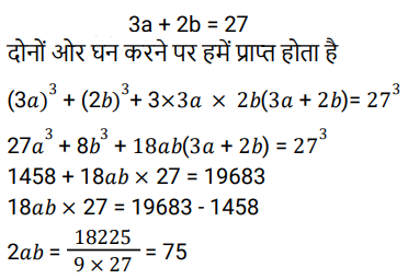 2. यदि 3a + 2b = 27 और 27a³ + 8b³ = 1458 है, तो 2ab का मान ज्ञात कीजिए। [SSC CGL 18/09/2024 (3rd Shift)]