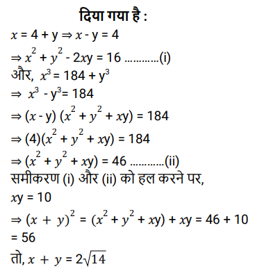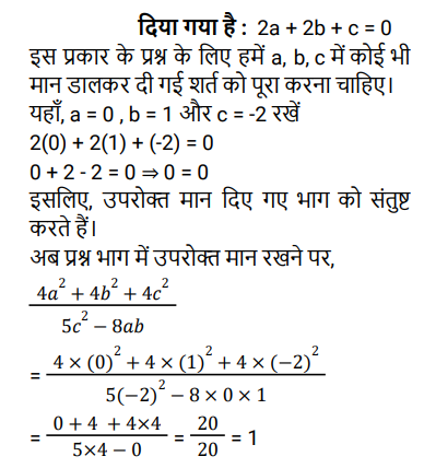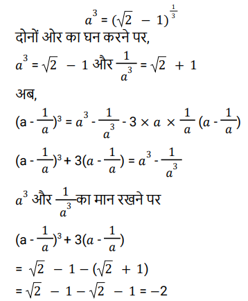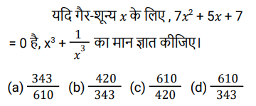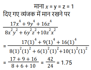 बीजगणित (SSC) (Part-III)Total Questions: 5041. (x − 5) सेपूर्णतः विभाज्य बहुपद प्राप्त करने के लिए (𝓍³ - 3𝓍² + 4𝓍 - 75) में क्या जोड़ा जाना चाहिए ? [SSC CPO 29/06/2024 (1st Shift)](a) 5(b) 6(c) 4(d) 2Correct Answer: (a) 5Solution:42. यदि a + b + c = 13 और ab + bc + ca = 22 है, तो a³ + b³ + c³ - 3abc का मान ______ है। [SSC CPO 29/06/2024 (2nd Shift)](a) 1911(b) 1225(c) 1625(d) 1339Correct Answer: (d) 1339Solution:43. यदि 𝓍² + 4y² + 2𝓍 + 1 = 0 है, तो 𝓍³⁹ + y³⁶ का मान ज्ञात कीजिए। [SSC CPO 29/06/2024 (2nd Shift)](a) -1(b) -2(c) 2(d) 1Correct Answer: (a) -1Solution:44. दिए गए प्रश्न का उत्तर ज्ञात कीजिए ? [SSC CPO 29/06/2024 (3rd Shift)](a) 30(b) 32(c) 28(d) 34Correct Answer: (a) 30Solution:45. दिए गए प्रश्न का उत्तर ज्ञात कीजिए ? [SSC CPO 29/06/2024 (3rd Shift)](a) - 1(b) -2√3(c) 1(d) 2√3Correct Answer: (c) 1Solution:46. दिए गए प्रश्न का उत्तर ज्ञात कीजिए ? [SSC CPO 29/06/2024 (3rd Shift)](a) 2(b) -2(c) √2(d) -√2Correct Answer: (b) -2Solution:47. यदि x³ = 184 + y³ और x = 4 + y है, तो (x + y) का मान ज्ञात कीजिए। (दिया गया है कि x > 0 और y > 0 है) [Higher Secondary 21/06/2024 (Shift - 2)](a) -2√11(b) 2√14(c) -2√14(d) 2√11Correct Answer: (b) 2√14Solution:48. (𝓍 - 3y)³ + 27 (y³ - 𝓍y²) को हल कीजिए। [Higher Secondary 21/06/2024 (Shift - 2)](a) 𝓍³ - 3𝓍²y(b) 𝓍³ - 27y³ - 9𝓍²y(c) 𝓍³ - 27y³ - 9𝓍²y + 27𝓍y² + 27y² - 27y²(d) 𝓍³ - 9𝓍²yCorrect Answer: (d) 𝓍³ - 9𝓍²ySolution:49. दिए गए प्रश्न का उत्तर ज्ञात कीजिए ? [Higher Secondary 24/06/2024 (Shift - 2)](a) 2.00(b) 3.25(c) 2.50(d) 1.75Correct Answer: (d) 1.75Solution:50. दिए गए प्रश्न का उत्तर ज्ञात कीजिए ? [Higher Secondary 24/06/2024 (Shift - 2)](a)(b)(c)(d)Correct Answer: (d)Solution:Submit Quiz« Previous12345