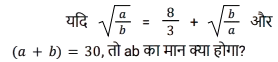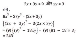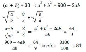 बीजगणित (SSC) (Part-IV)Total Questions: 5021. यदि (x - 2), (2x² + 12kx - 25k), का गुणनखंड है, तो k का मान क्या है? [SSC MTS 01/09/2023 (2nd Shift)](a) 2(b) 8(c) 4(d) 6Correct Answer: (b) 8Solution:22. दिए गए प्रश्न का उत्तर ज्ञात कीजिए ? [SSC CHSL 02/08/2023 (1st Shift)](a) 81/11(b) 81/7(c) 71/8(d) 81/8Correct Answer: (d) 81/8Solution:23. यदि (a - b) = 9 और (a³ - b³) = 4401 है, तो ab का मान ज्ञात कीजिए। [SSC CHSL 02/08/2023 (2nd Shift)](a) 190(b) 112(c) 162(d) 136Correct Answer: (d) 136Solution:24. दिए गए प्रश्न का उत्तर ज्ञात कीजिए ? [SSC CHSL 02/08/2023 (2nd Shift)](a) 22.5(b) 34(c) 25.5(d) 36Correct Answer: (c) 25.5Solution:25. दिए गए प्रश्न का उत्तर ज्ञात कीजिए ? [SSC CHSL 02/08/2023 (3rd Shift)](a) √6(b) √10(c) √15(d) √7Correct Answer: (c) √15Solution:26. दिए गए प्रश्न का उत्तर ज्ञात कीजिए ? [SSC CHSL 03/08/2023 (1st Shift)](a) 64(b) 28(c) 81(d) 36Correct Answer: (c) 81Solution:27. यदि 2𝑥 + 3𝑦 = 9,और 𝑥𝑦 = 3, तो 8𝓍³ + 27y का मान ज्ञात कीजिए I [SSC CHSL 03/08/2023 (1st Shift)](a) 235(b) 244(c) 243(d) 234Correct Answer: (c) 243Solution:28. दिए गए प्रश्न का उत्तर ज्ञात कीजिए ? [SSC CHSL 03/08/2023 (3rd Shift)](a) 5/3√3(b) 10/3√3(c) 7/3√3(d) 8/3√3Correct Answer: (b) 10/3√3Solution:29. यदि a + b = 10 और a² + b² = 58 है, तो ab का मान ज्ञात कीजिए। [SSC CHSL 03/08/2023 (3rd Shift)](a) 24(b) 27(c) 30(d) 21Correct Answer: (d) 21Solution:30. यदि (a + b + c) ≠ 0 है, तो (a + b + c) (a² + b² + c² - ab - bc - ca) का मान _______के बराबर है। [SSC CHSL 03/08/2023 (4th Shift)](a) a³ + b³ - c³ - 3abc(b) a³ - b³ + c³ - 3abc(c) a³ + b³ + c³ - 3abc(d) a³ + b³ + c³ + 3abcCorrect Answer: (c) a³ + b³ + c³ - 3abcSolution:Submit Quiz« Previous12345Next »