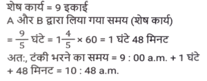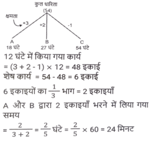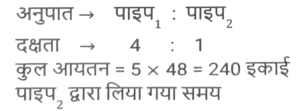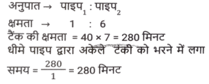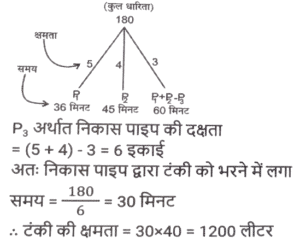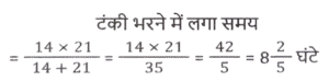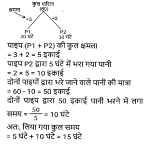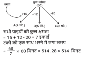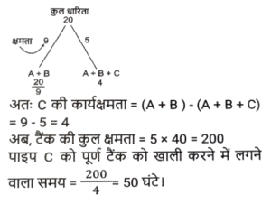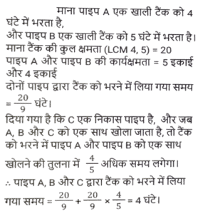 पाइप और टंकीTotal Questions: 5041. दो इनलेट पाइप, P1 और P2, एक टंकी को क्रमशः 20 घंटे और 30 घंटे में भर सकते हैं। उन्हें एक ही समय पर खोला गया, लेकिन टंकी के पूरा भरने से 5 घंटे पहले पाइप P1 को बंद करना पड़ा। दोनों पाइपों के द्वारा टंकी को भरने में कुल कितने घंटे लगे? [SSC CGL 19/09/2024 (3rd Shift)](a) 15 घंटे(b) 9 घंटे(c) 12 घंटे(d) 10 घंटेCorrect Answer: (a) 15 घंटेSolution:42. एक टंकी को पाइप A द्वारा 4 घंटे में और पाइप B द्वारा 6 घंटे में भरा जा सकता है। 8:00 a.m. पर पाइप A को खोला गया। यदि पाइप B को 9:00 a.m. पर खोला जाए तो टंकी किस समय भर जाएगी? [SSC CGL 23/09/2024 (1st Shift)](a) 10:16 a.m.(b) 10:22 a.m.(c) 10:48 a.m.(d) 10:18 a.m.Correct Answer: (c) 10:48 a.m.Solution:43. एक पाइप, दूसरे पाइप की तुलना में किसी टंकी को 6 गुना तेजी से भर सकता है। यदि दोनों पाइप एक साथ टंकी को 40 मिनट में भर सकते हैं, तो धीमा पाइप अकेले टंकी को कितने मिनट में भरेगा? [SSC CGL 24/09/2024 (1st Shift)](a) 275(b) 285(c) 290(d) 280Correct Answer: (d) 280Solution:44. पाइप A एक खाली टैंक को अकेले भरने में, पाइप B द्वारा लिए गए आवश्यक समय का 4/5 समय लेता है। जब एक निर्गम पाइप C को पाइप A और B के साथ एकसाथ खोला जाता है, तो खाली टैंक को भरने में केवल पाइप A और पाइप B को एक साथ खोलने में लगने वाले समय की तुलना में 4/5 अधिक समय लगता है। यदि तीनों पाइपों को एकसाथ खोलने पर टैंक को भरने में 40 घंटे लगते हैं, तो अकेले कार्य करते हुए पाइप C कितने समय में (घंटों में) पूरा टैंक खाली कर देगा? [SSC CGL 24/09/2024 (2nd Shift)](a) 50(b) 45(c) 65(d) 75Correct Answer: (a) 50Solution:45. पाइप A एक टंकी को 4 घंटे में भर सकता है और पाइप B उसी टंकी को 5 घंटे में भर सकता है। पाइप C पूरी टंकी को 3 घंटे में खाली कर सकता है। यदि सभी तीन पाइप एक साथ खोले जाते हैं, तो टंकी को भरने में कितना समय (मिनट में) लगेगा? (निकटतम मिनट तक पूर्णांकित) [SSC CGL 24/09/2024 (3rd Shift)](a) 625(b) 445(c) 800(d) 514Correct Answer: (d) 514Solution:46. दो पाइप X और Y एक टंकी को क्रमशः 14 घंटे और 21 घंटे में भर सकते हैं। टंकी को भरने के लिए दोनों पाइप एक साथ खोले जाते हैं। खाली टंकी कितने घंटे में भर जायेगी? [SSC CGL 25/09/2024 (2nd Shift)](a) 8⅖ घंटे(b) 6⅖ घंटे(c) 7⅖ घंटे(d) 5⅖ घंटेCorrect Answer: (a) 8⅖ घंटेSolution:47. एक पाइप, दूसरे पाइप की तुलना में चार गुना तेजी से एक टैंक भर सकता है। यदि दोनों पाइप मिलकर टैंक को 48 मिनट में भर सकते हैं, तो धीमा पाइप अकेले टैंक को कितने समय में भरने में सक्षम होगा? [SSC CGL 26/09/2024 (1st Shift)](a) 192 मिनट(b) 288 मिनट(c) 240 मिनट(d) 144 मिनटCorrect Answer: (c) 240 मिनटSolution:48. पाइप A और B एक टंकी को क्रमशः 18 घंटे और 27 घंटे में भर सकते हैं, जबकि पाइप C पूरी टंकी को 54 घंटे में खाली कर सकता है। तीनों पाइप एक साथ खोले जाते हैं, लेकिन पाइप C को 12 घंटे बाद बंद कर दिया जाता है। पाइप A और B मिलकर टंकी के शेष भाग के एक - तिहाई हिस्से को कितने समय में (मिनट में) भर देंगे? [Higher Secondary 21/06/2024 (Shift - 2)](a) 24(b) 36(c) 30(d) 15Correct Answer: (a) 24Solution:49. दो पाइप एक टंकी को अलग-अलग तौर पर क्रमशः 36 मिनट और 45 मिनट में भर सकते हैं। टंकी में लगा एक निकास पाइप प्रति मिनट 40 लीटर पानी निकाल सकता है। यदि तीन