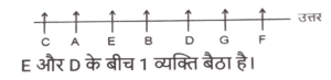 बैठने की व्यवस्था (भाग-II)Total Questions: 501. छ विद्यार्थी प्रतीक, समीर, कबीर, जिया, जोसफ, किरण एक वृत्ताकार मेज के परितः केंद्र की ओर मुख करके बैठे हैं (उनका इसी क्रम में होना अनिवार्य नहीं है)। प्रतीक, समीर और कबीर दोनों के ठीक बगल में है। जिया, समीर के दाईं ओर दूसरे स्थान पर बैठी है। किरण, कबीर के बाईं ओर तीसरे स्थान पर बैठी है। जोसेफ, जिया और कबीर दोनों के ठीक बगल में है। [SSC CPO 03/10/2023 (3rd Shift)]जोसेफ के बाई ओर ठीक बगल में कौन बैठा /बैठी है?(a) कबीर(b) समीर(c) किरण(d) जियाCorrect Answer: (d) जियाSolution:2. सात व्यक्ति A, B, C, D, E, F और G उत्तर की ओर मुख करके एक सीधी पंक्ति में बैठे हैं (उनका इसी क्रम में होना अनिवार्य नहीं है)। D की दाईं ओर केवल 2 व्यक्ति बैठे हैं। G, D के ठीक बगल में बैठा है। A और G के बीच में केवल 3 व्यक्ति बैठे हैं। B और C के बीच में केवल 2 व्यक्ति बैठे हैं। E, C के ठीक बगल में नहीं है। F, G के दाईं ओर ठीक बगल में बैठा है। E और D के बीच में कितने व्यक्ति बैठे हैं ? [SSC CPO 04/10/2023 (1st Shift)](a) 2(b) 0(c) 1(d) 3Correct Answer: (c) 1Solution:3. छः विद्यार्थी प्रतीक, समीर, कबीर, जिया, जोसफ, किरण एक वृत्ताकार मेज के परितः केंद्र की ओर मुख करके बैठे हैं (उनका इसी क्रम में होना अनिवार्य नहीं है। प्रतीक, समीर और कबीर दोनों के ठीक बगल में है। जिया, समीर के दाईं ओर दूसरे स्थान पर बैठी है। किरण, कबीर के बाईं ओर तीसरे स्थान पर बैठी है। जोसेफ, जिया और कबीर दोनों के ठीक बगल में है। [SSC CPO 04/10/2023 (2nd Shift)]जिया के ठीक बगल में कौन है ?(a) समीर(b) प्रतीक(c) कबीर(d) किरणCorrect Answer: (d) किरणSolution:4. सात छात्र A, B, C, D, E, F और G किसी वृत्ताकार मेज के परितः केंद्र की ओर मुख करके बैठे हैं। C, E और F के ठीक बगल में है। D, C के बाईं ओर तीसरे स्थान पर, और A के दाईं ओर ठीक बगल में है। A, E के दाईं ओर दूसरे स्थान पर बैठा है। B, E और A दोनों के ठीक बगल में है। G, F के बाईं ओर ठीक बगल में है। C और G दोनों के ठीक बगल में कौन है? [SSC CPO 04/10/2023 (3rd Shift)](a) F(b) A(c) E(d) DCorrect Answer: (a) FSolution:5. छह मित्र एक वृत्ताकार स्थिति में केंद्र की ओर मुख करके बैठे हुए हैं। सुमित, अमित के दाई ओर दूसरे स्थान पर बैठा है। करण, परम के ठीक बगल में है। टोनी, अमित के दाई ओर तीसरे स्थान पर बैठा है। धरम, अमित और सुमित के ठीक बगल में बैठा है। करण, सुमित के दाईं ओर दूसरे स्थान पर बैठा है। परम के दाईं ओर चौथे स्थान पर कौन बैठा है ? [SSC CPO 05/10/2023 (1st Shift)](a) करण(b) टोनी(c) धरम(d) सुमितCorrect Answer: (b) टोनीSolution:6. सात व्यक्ति A, B, C, D, E, F और G उत्तर की ओर मुख करके एक सीधी पंक्ति में बैठे हैं। D के दाईं ओर केवल 2 व्यक्ति बैठे हैं। G, D के ठीक बगल में बैठा है। A और G के बीच में केवल 3 व्यक्ति बैठे हैं। B और C के बीच में केवल 2 व्यक्ति बैठे हैं। E, C के ठीक बगल में नहीं है। F, G के दाईं ओर ठीक बगल में बैठा है। [SSC CPO 05/10/2023 (3rd Shift)]A के बाईं ओर ठीक बगल में कौन बैठा हुआ है?(a) B(b) C(c) D(d) ECorrect Answer: (b) CSolution:7. छः विद्यार्थी मीरा, जिज्ञासा, तरुण, नैना, शांभवी औ