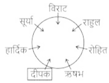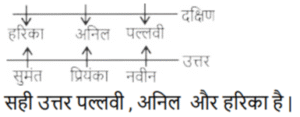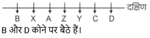 बैठने की व्यवस्था (भाग-II)Total Questions: 5041. पाँच भाई ड्रेक, डेविड, डैनी, डर्क और डिम उत्तर की ओर मुख करके एक बेंच पर बैठे हैं। डर्क, डैनी के ठीक दाईं ओर बैठा है। डिम, ड्रेक और डेविड के ठीक बीच में बैठा है। ड्रेक के बाईं ओर कोई नहीं बैठा है। डैनी के ठीक बाईं ओर कौन बैठा है? [SSC MTS 08/05/2023 (Morning)](a) डर्क(b) डेविड(c) ड्रेक(d) डिमCorrect Answer: (b) डेविडSolution:42. सात छात्र A, B, C, D, X, Y और Z अपनी कक्षा में दक्षिण दिशा की ओर मुख करके बैठे हैं। A और D एक साथ नहीं बैठे हैं। Z, X के बाएं से दूसरे स्थान पर बैठा है। B, Z के साथ नहीं बैठा है। X, C के दाएँ से चौथे स्थान पर है। A और B एक साथ नहीं बैठे हैं। C, D और Y के बीच में बैठा है। Y, B के बाएँ से दूसरे स्थान पर बैठे व्यक्ति के बाएँ से दूसरे स्थान पर बैठा है। अंतिम छोरो पर कौन बैठा है? [SSC MTS 09/05/2023 (Afternoon)](a) B और D(b) C और Y(c) Z और X(d) A और BCorrect Answer: (a) B और DSolution:43. 6 लोगों के एक परिवार में अनिल, पल्लवी, नवीन, सुमंत, प्रियंका, हरिका दो पंक्तियों में बराबर संख्या में एक दूसरे की ओर मुख करके बैठे हैं। नवीन और प्रियंका पड़ोसी हैं जो उत्तर की ओर मुख करके बैठे हैं। हरिका, नवीन के विकर्णतः सम्मुख बैठी है। पल्लवी, हरिका के बायीं ओर बैठी है। प्रियंका, अनिल के सम्मुख बैठी है। निम्नलिखित में से कौन से तीन व्यक्ति, दोनों पंक्तियों में से किसी एक पंक्ति में बैठे हैं? [SSC MTS 09/05/2023 (Afternoon)](a) पल्लवी, अनिल, हरिका(b) हरिका, सुमंत, पल्लवी(c) हरिका, प्रियंका, नवीन(d) पल्लवी, नवीन, प्रियंकाCorrect Answer: (a) पल्लवी, अनिल, हरिकाSolution:44. Q, R, और S एक सीधी पंक्ति में दक्षिण की ओर मुख करके बैठे हैं। U, W, और x एक समानांतर पंक्ति में उत्तर की ओर मुख करके बैठे हैं। Q, S के ठीक बाएँ पर और W के सम्मुख बैठा है। R, जो U के सम्मुख है, S के ठीक दाईं ओर बैठा है। U के ठीक दाईं ओर कौन बैठा है? [SSC MTS 10/05/2023 (Afternoon)](a) Q(b) W(c) S(d) XCorrect Answer: (d) XSolution:45. सात लड़कियाँ मानसी, श्वेता, मोनिका, पायल, आरती, काजल और लक्ष्मी एक वृत्ताकार मेज के चारों ओर केंद्र के विपरीत दिशा की ओर मुख करके बैठी हैं (परंतु जरूरी नहीं कि वे इसी क्रम में बैठीं हों)। आरती, काजल के बाईं ओर से दूसरे स्थान पर है। मोनिका, काजल के दाईं ओर से तीसरे स्थान पर है। मानसी, काजल की निकटतम पडोसी नहीं है। लक्ष्मी, मानसी के बाईं ओर से दूसरे स्थान पर है। पायल, लक्ष्मी की निकटतम पड़ोसी नहीं है। लक्ष्मी के बाईं ओर से दूसरे स्थान पर कौन है? [SSC MTS 10/05/2023 (Evening)](a) मानसी(b) काजल(c) पायल(d) आरतीCorrect Answer: (b) काजलSolution:46. P, Q, R, और S एक बेंच पर दक्षिण की ओर मुख करके बैठे हैं और A, B, C और D एक समानांतर बेंच पर उत्तर की ओर मुख करके बैठे हैं। S और B एक दूसरे के सम्मुख बैठे हैं। A, D और C के ठीक बीच में बैठा है। P, C के सम्मुख बैठा है। Q, S के ठीक बाईं ओर बैठा है। R के स्थान के संदर्भ में निम्नलिखित में से कौन-सा कथन सही है? [SSC MTS 11/05/2023 (Morning)](a) A के सम्मुख R बैठा है(b) D के सम्मुख R बैठा है(c) Q के ठीक दाईं