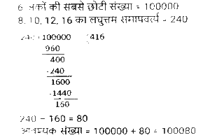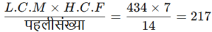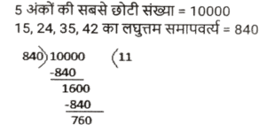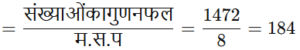 महत्तम समापवर्तक और लघुत्तम समापवर्त्य (रेलवे गणित) Part-2Total Questions: 5011. (a³ + b³), (a + b)² और (a² - b²) का म. स. प (HCF) ज्ञात कीजिए। [RRB JE 31/05/2019 (Evening)](a) (a + b) (b) (a - b) (c) (a + b)(a - b) (d) (a³ + b³)(a² - b²)Correct Answer: (a) (a + b) Solution:हम जानते हैं कि(a³ + b³) = (a + b)(a² - ab + b²)(a + b)² = (a + b)(a + b), (a² - b²) = (a + b)(a - b) उनका म. स. प (HCF) = (a + b) है12. दो संख्याओं का HCF 7 है और उनका LCM 434 है। यदि संख्याओं में से एक 14 है, तो दूसरी संख्या ज्ञात कीजिए। [Group D 17/08/2022 (Evening)](a) 146 (b) 217(c) 52 (d) 48Correct Answer: (b) 217Solution:दूसरी संख्या 13. 108 और 144 का HCF ज्ञात करें। [Group D 18/08/2022 (Evening)](a) 36 (b) 16 (c) 24 (d) 12Correct Answer: (a) 36 Solution:108 = 3 × 4 × 9144 = 4 × 4 × 9108 और 144 का म.स. = 4 × 9 = 3614. दो संख्याएँ 5 : 7 के अनुपात में हैं। यदि उनका महत्तम समापवर्तक 17 है, तो संख्याएँ ज्ञात कीजिए। [Group D 22/08/2022 (Morning)](a) 85, 119 (b) 102, 136 (c) 68, 85 (d) 85, 102Correct Answer: (a) 85, 119 Solution:संख्याएँ = 17 × 5 और 17 × 7= 85, 11915. दो संख्याओं का गुणनफल 1472 है और उनका म.स.प. 8 है। उनका लघुत्तम समापवर्त्य ज्ञात कीजिए। [Group D 22/08/2022 (Evening)](a) 144 (b) 108 (c) 184 (d) 176Correct Answer: (d) 176Solution:लघुत्तम समापवर्त्य 16. 45, 78 और 117 का महत्तम समापवर्तक (HCF) ज्ञात कीजिए। [Group D 23/08/2022 (Morning)](a) 9 (b) 5 (c) 7 (d) 3Correct Answer: (d) 3Solution:45 = 3 × 3 × 578 = 2 × 3 × 13117 = 3 × 3 × 1345, 78 और 117 का महत्तम समापवर्तक = 317. वह छोटी से छोटी संख्या ज्ञात कीजिए, जिसे 2488 में जोड़ने पर प्राप्त संख्या 3, 4, 5 और 6 से पूर्णतः विभाज्य होगी। [Group D 23/08/2022 (Evening)](a) 34 (b) 28 (c) 42 (d) 32Correct Answer: (d) 32Solution:3, 4, 5, 6 का लघुत्तम समापवर्त्य = 60 60 - 28 = 3232 को 2488 में जोड़ा जाना चाहिए।18. छह अंकों की वह छोटी से छोटी संख्या ज्ञात कीजिए, जो 8, 10, 12 और 16 से पूर्णतः विभाज्य हो [Group D 24/08/2022 (Evening)](a) 100040 (b) 100020 (c) 100060 (d) 100080Correct Answer: (d) 100080Solution:6 अंकों की सबसे छोटी संख्या = 1000008, 10, 12, 16 का लघुत्तम समापवर्त्य = 240 240 - 160 = 80आवश्यक संख्या = 100000 + 80 = 10008019. 5 अंकों की वह छोटी से छोटी संख्या ज्ञात कीजिए, जिसे 15, 24, 35 और 42 से विभाजित करने पर प्रत्येक स्थिति में शेषफल 13 प्राप्त होगा। [Group D 25/08/2022 (Morning)](a) 10067 (b) 10073 (c) 10093(d) 10106Correct Answer: (c) 10093Solution:20. दो धन पूर्णांकों का योगफल 55 है। यदि उनके महत्तम समापवर्तक (HCF) और लघुत्तम समापवर्त्य (LCM) क्रमशः: 5 और 120 हैं, तो उनके व्युत्क्रमों का योगफल ________ है। [Group D 25/08/2022 (Morning)](a) 120/13 (b) 11/120(c) 14/6 (d) 12/13Correct Answer: (b) 11/120Solution:माना दो संख्याएँ x और y हैं।दो संख्याओं का गुणनफल (xy)= L.C.M × H.C.F = 5 × 120 = 600उनके व्युत्क्रमों का योग Submit Quiz« Previous12345Next »