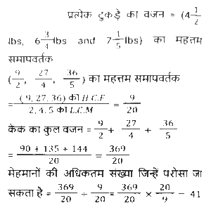 महत्तम समापवर्तक और लघुत्तम समापवर्त्य (रेलवे गणित) Part-5Total Questions: 5041. पहले 100 धनात्मक पूर्णांकों में से कितने शेषफल के बिना 3 या 4 से विभाज्य हैं? [RRB NTPC 08/02/2021 (Evening)](a) 58 (b) 85 (c) 5 (d) 50Correct Answer: (d) 50Solution:3 से विभाज्य पूर्णांकों की संख्या = 100 ÷ 3 = 33 (भागफल)4 से विभाज्य पूर्णांकों की संख्या = 100 ÷ 4 = 253 और 4 का LCM = 123 और 4 दोनों से विभाज्य पूर्णांकों की संख्या = 100 ÷ 12 = 8पूर्णांकों की अभीष्ट संख्या = 33 + 25 − 8 = 5042. 12, 15 और 18 से विभाज्य चार अंकों की सबसे बड़ी संख्या है: [RRB NTPC 08/02/2021 (Evening)](a) 9000 (b) 9750 (c) 9450 (d) 9900Correct Answer: (d) 9900Solution:12, 15, 18 का LCM = 1804 अंकों की सबसे बड़ी संख्या = 9999आवश्यक संख्या 180 का गुणज होनी चाहिएजब हम 9999 को 180 से भाग देते हैं तो हमें 99 शेषफल मिलता है⇒ 9999 − 99 = 990043. दो संख्याओं का LCM 96 है और उनका HCF 8 है। यदि दो संख्याओं में से एक संख्या 32 है, तो दूसरी संख्या क्या है? [RRB NTPC 08/02/2021 (Evening)](a) 28 (b) 16 (c) 48 (d) 24Correct Answer: (d) 24Solution:दो संख्याओं का गुणनफल = HCF × LCM32 × दूसरी संख्या = 8 × 96दूसरी संख्या = (8 × 96) ÷ 32 = 2444. दो धनात्मक संख्याओं के LCM और HCF का गुणनफल 36 है। दोनों संख्याओं का अंतर 5 है। संख्याएँ ज्ञात कीजिए। [RRB NTPC 09/02/2021 (Evening)](a) 5 और 8 (b) 5 और 9 (c) 4 और 9(d) 4 और 8Correct Answer: (c) 4 और 9Solution:दो संख्याओं का गुणनफल = म.स.प × ल.स.प = 36मान लीजिए कि संख्याएँ a और b हैंab = 36और a − b = 5 ⇒ a = 5 + bपहले समीकरण में 'a' का मान रखें(5 + b) b = 36 ⇒ 9 × 4दोनों पक्षों की तुलना करने पर, हम प्राप्त करते हैंb = 4 ⇒ a = 5 + 4 = 945. दो संख्याओं का LCM उनके HCF का 26 गुणा है। HCF और LCM का योग 729 है। यदि एक संख्या 81 है, तो दूसरी संख्या ज्ञात कीजिए। [RRB NTPC 09/02/2021 (Evening)](a) 233 (b) 232 (c) 234(d) 231Correct Answer: (c) 234Solution:माना महत्तम समापवर्तक = xलघुत्तम समापवर्तक = 26xऔर x + 26x = 729⇒ 27x = 729⇒ x = 27महत्तम समापवर्तक = 27और लघुत्तम समापवर्तक = 702दो संख्याओं का गुणनफल = म.स.प × ल.स.प81 × दूसरी संख्या = 27 × 702दूसरी संख्या = (27 × 702) ÷ 81 = 23446. दो संख्याओं का HCF 29 है और उनके LCM के अन्य दो गुणनखंड 13 और 17 हैं। दो संख्याओं में से सबसे छोटी संख्या कौन सी है? [RRB NTPC 09/02/2021 (Evening)](a) 493 (b) 373 (c) 377(d) 387Correct Answer: (c) 377Solution:छोटी संख्या = 13 × 29 = 37747. दो सह-अभाज्य संख्याओं का लघुत्तम समापवर्त्य 638 है। यदि एक संख्या 29 है, तो दूसरी संख्या है [RRB NTPC 11/02/2021 (Morning)](a) 32 (b) 22(c) 11 (d) 13Correct Answer: (b) 22Solution:सह अभाज्य संख्याओं का महत्तम समापवर्तक = 1दो संख्याओं का गुणनफल = लघुत्तम समापवर्तक × महत्तम समापवर्तक29 × दूसरी संख्या = 638 × 1दूसरी संख्या = 638 ÷ 29 = 2248. तीन पूर्ण केक के भार क्रमशः 4½ lbs, 6¾ lbs और 7⅕ lbs हैं। प्रत्येक केक को समान भार के टुकड़ों में विभाजित किया जाना है। प्रत्येक टुकड़ा अधिकतम संभव भार का होना चाहिए। यदि प्रत्येक मेहमान को एक टुकड़ा दिया जाता है, तो अधिकतम कितने मेहमानों को केक का टुकड़ा दिया जा सकता है? [RRB NTPC 11/02/2021 (Morning)](a) 54 (b) 72 (c) 45 (d) 41Correct Answer: (d) 41Solution:49. वह सबसे बड़ी संख्या क्या है जिससे 38, 45, 52 को विभाजित करने पर क्रमशः 2, 3 और 4 शेषफल प्राप्त होता है? [RRB NTPC 11/02/2021 (Evening)](a) 6 (b) 7 (c) 9 (d) 5Correct Answer: (a) 6 Solution:शेषफल = 2, 3, 438 − 2 = 3645 − 3 = 4252 − 4 = 48(36, 42, 48) का महत्तम 