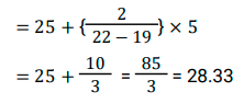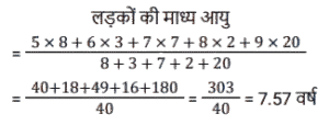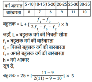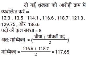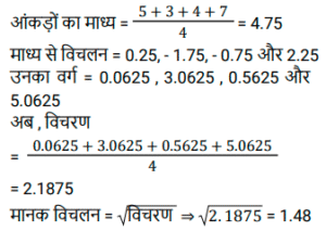माध्य, माध्यिका और बहुलकTotal Questions: 5321. दिए गए आंकड़ों का बहुलक (mode) ज्ञात कीजिए। 21, 15, 16, 48, 6, 15, 44, 16, 6, 5, 15, 16, 21, 6, 15 और 43 [SSC CHSL Tier II (02/11/2023)](a) 16(b) 21(c) 6(d) 15Correct Answer: (d) 15Solution:बहुलक दिए गए डेटा की उच्चतम आवृत्ति संख्या है। प्रश्न में, हम देख सकते हैं कि 15 सबसे अधिक बार अर्थात् 4 बार आया हैं। ∴ दिए गए डेटा का बहुलक = 1522. एक कारखाने में कार्यरत 100 श्रमिकों का उनके मासिक वेतन के अनुसार वितरण, औसत वेतन ₹4,500 प्रति माह दर्शाता है। यदि माध्यिका वेतन ₹4,900 पाया जाता है, तो बहुलक वेतन ज्ञात करें। [SSC CHSL Tier II (10/01/2024)](a) ₹5,600(b) ₹5,500(c) ₹5,700(d) ₹5,800Correct Answer: (c) ₹5,700Solution:माध्य (औसत) = 4500, माध्यिका = 4900 हम जानते हैं कि, बहुलक = 3 × माध्यिका - 2 × माध्य बहुलक = 3 × 4900 - 2 × 4500 बहुलक = 570023. एक परीक्षा में पूर्णांक 25 में से 15 विद्यार्थियों द्वारा प्राप्त अंक 13, 11, 16, 15, 18, 12, 13, 14, 10, 22, 15, 21, 20, 17 और 24 हैं। आँकड़ों के इस समुच्चय के बहुलकों का गुणनफल ज्ञात कीजिए। [SSC CGL Tier II (26/10/2023)](a) 192(b) 210(c) 182(d) 195Correct Answer: (d) 195Solution:जैसा कि हम जानते हैं, बहुलक वह मान हैजो सबसे अधिक बार दिखाई देता है। तो, समुच्चय के इस सेट का बहुलक = 15 (2 बार ) और 13 (2 बार ) तब, आवश्यक गुणनफल = 15 × 13 = 19524. 23 प्रेक्षणों का माध्य 36 है। यदि पहले 12 प्रेक्षणों का माध्य 32 है और अंतिम 12 प्रेक्षणों का माध्य 39 है, तो 12वाँ प्रेक्षण ज्ञात कीजिए। [SSC MTS 11/09/2023 (2nd Shift)](a) 26(b) 23(c) 24(d) 25Correct Answer: (c) 24Solution:प्रश्न के अनुसार, 23 प्रेक्षणों का योग = 23 × 36 = 828 प्रथम 12 प्रेक्षणों का योग = 12 × 32 = 384 अंतिम 12 प्रेक्षणों का योग = 12 × 39 = 468 12वाँ प्रेक्षण = (384 + 468) - 828 = 2425. नीचे दी गई तालिका में अलग-अलग लड़कों की आयुके प्रेक्षित आकड़ो को दर्शाया गया है। तालिका का ध्यानपूर्वक अध्ययन कीजिए और नीचे दिए गए प्रश्न का उत्तर दीजिए [SSC CHSL 11/08/2023 (2nd Shift)](a) 6.57(b) 9.57(c) 7.57(d) 8.57Correct Answer: (c) 7.57Solution:26. निम्नलिखित आँकड़ों की माध्यिका ज्ञात कीजिए । 15, 30, 20, 10, 25, 35, 18, 21, 28 [SSC CHSL Tier II (26/06/2023)](a) 30(b) 18(c) 25(d) 21Correct Answer: (d) 21Solution:27. निम्नलिखित आँकड़ों की माध्यिका ज्ञात कीजिए। 129.75, 116.6, 12.3, 114.1, 136.6, 118.7, 13.5, 121.3 [SSC CHSL Tier II (26/06/2023)](a) 116.60(b) 117.65(c) 118.75(d) 127.80Correct Answer: (b) 117.65Solution:28. दिए गए बंटन का बहुलक ज्ञात कीजिए (दो दशमलव स्थान तक पूर्णांकित)। [SSC CGL Tier II (02/03/2023)](a) 35.25(b) 40.25(c) 30.33(d) 28.33Correct Answer: (d) 28.33Solution:29. निम्नलिखित आकड़ो का मानक विचलन ज्ञात करें। (दो दशमलव स्थान तक पूर्णांकित) 5, 3, 4, 7 [SSC CGL Tier II (03/03/2023)](a) 1.48(b) 3.21(c) 4.12(d) 2.45Correct Answer: (a) 1.48Solution:30. एक नमूना आंकड़ों का माध्य = 60 और माध्यिका = 48 है तो इस बंटन का बहुलक ज्ञात कीजिए है: [SSC CGL Tier II (06/03/2023)](a) 18(b) 48(c) 36(d) 24Correct Answer: (d) 24Solution:बहुलक = 3 माध्यिका − 2 माध्य बहुलक = 3 × 48 − 2 × 60 ⇒ बहुलक = 24Submit Quiz« Previous123456Next »