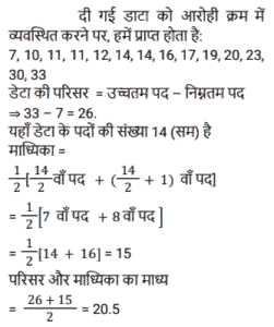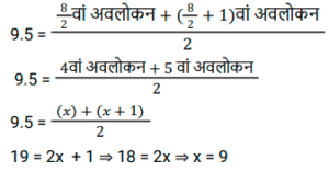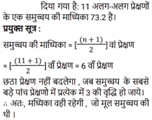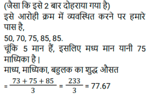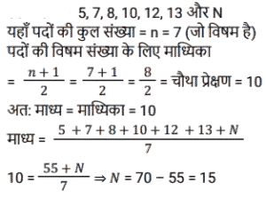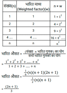 माध्य, माध्यिका और बहुलकTotal Questions: 5331. 11 विभिन्न प्रेक्षणों के एक समुच्चय की माध्यिका 73.2 है। यदि समुच्चय के सबसे बड़े पाँच प्रेक्षणों में से प्रत्येक में 3 की वृद्धि की जाती है, तो इस नए समुच्चय की माध्यिका: [SSC CGL Tier II (07/03/2023)](a) मूल समुच्चय की माध्यिका की 3 गुना हो जाती है(b) 3 बढ़ जाती है(c) मूल समुच्चय की माध्यिका के समान ही रहती है(d) 3 घट जाती हैCorrect Answer: (c) मूल समुच्चय की माध्यिका के समान ही रहती हैSolution:32. यदि भार संगत संख्याएं हैं, तो प्रथम 'n' प्राकृत संख्याओं का भारित समांतर माध्य ज्ञात करें। [SSC CGL 02/12/2022 (2nd Shift)](a)(b)(c)(d)Correct Answer: (c)Solution:33. एक छात्र द्वारा विभिन्न विषयों में प्राप्त अंक नीचे तालिका में दिए गए हैं। [SSC CPO 09/11/2022 (Morning)](a) 79.33(b) 77.67(c) 82.66(d) 7Correct Answer: (b) 77.67Solution:34. एक पासे को निम्नलिखित तालिका में दिखाए गए अनुसार 1, 2, 3, 4, 5, और 6 परिणामो की बारम्बारता के साथ 1,000 बार फेंका जाता है। पासे पर 5 से बड़ी या उसके बराबर संख्या कितनी बार आएगी ? [SSC CHSL 03/06/2022 (Morning)](a) 365(b) 535(c) 190(d) 356Correct Answer: (a) 365Solution:5 या 5 सेअधिक के परिणाम के लिए कुल बारम्बारता = 190 + 175 = 36535. एक पासे को 150 बार फेंका जाता है, जिसके परिणामों की 1, 2, 3, 4, 5 और 6 की बारंबारता निम्न तालिका में दी गई है। पासे पर आने वाली संख्या कितनी बार एक अभाज्य संख्या होती है? [SSC CHSL 06/06/2022 (Evening)](a) 88(b) 109(c) 86(d) 66Correct Answer: (c) 86Solution:पासेपर एक अभाज्य संख्या दिखाई देने वाली संख्या की कुल बारंबारता = 43 + 33 + 10 = 8636. दिए गए आंकड़ों के मध्यिका और बहुलक का माध्य क्या है [SSC MTS 05/10/2021 (Afternoon)](a) 17(b) 18(c) 17.75(d) 17.25Correct Answer: (c) 17.75Solution:37. दिए गए आँकड़ों के परिसर और माध्यिका का माध्य क्या है? [SSC MTS 06/10/2021 (Evening)](a) 20.5(b) 25.5(c) 24(d) 19Correct Answer: (a) 20.5Solution:38. मध्यम विषम वितरण में बहुलक और माध्यिका का मान क्रमशः 7.52 और 9.06 है। वितरण का माध्य है : [SSC MTS 07/10/2021 (Afternoon)](a) 9.83(b) 8.67(c) 10.23(d) 9.5Correct Answer: (a) 9.83Solution:विषम वितरण के लिए, बहुलक = 3 (माध्यिका) – 2 (माध्य) 7.52 = 3 (9.06) – 2 (माध्य) 7.52 = 27.18 – 2 (माध्य) 2(माध्य) = 19.66 माध्य = 9.8339. एक अपरिष्कृत डेटा आरोही क्रम में है, अर्थात 3, 4, 7, x, x + 1, 12, 13, 15. यदि इस डेटा की माध्यिका 9.5 है, तो x इसके बराबर है: [SSC MTS 07/10/2021 (Evening)](a) 7.5(b) 8.5(c) 8(d) 9Correct Answer: (d) 9Solution:40. संख्या 5, 7, 8, 10, 12, 13 और N को आरोही क्रम में व्यवस्थित किया गया है। यदि संख्याओं का माध्य माध्यिका के बराबर है, तो N का मान है : [SSC MTS 08/10/2021 (Morning)](a) 16(b) 25(c) 15(d) 14Correct Answer: (c) 15Solution:Submit Quiz« Previous123456Next »