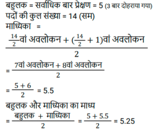 माध्य, माध्यिका और बहुलकTotal Questions: 5351. दिए गए डेटा के बहुलक और माध्यिका का माध्य क्या है ? [SSC MTS 26/10/2021 (Afternoon)](a) 5(b) 5.25(c) 5.50(d) 6Correct Answer: (b) 5.25Solution:52. एक हफ्ते में चाय के बैग की कीमत ₹350, ₹280, ₹340, ₹270, ₹360, ₹310 और ₹300 थी। परिसर (₹ में) क्या है ? [SSC MTS 02/11/2021 (Afternoon)](a) 100(b) 80(d) 90(c) 70Correct Answer: (d) 90Solution:वितरण की परिसर = उच्चतम पद – न्यूनतम पद = 360 – 270 = 90 है।53. एक चर के वितरण का परिसर क्या है जो दस मान लेता है: [SSC MTS 02/11/2021 (Evening)](a) 23(b) 17(c) 21(d) 15Correct Answer: (a) 23Solution:वितरण का परिसर = उच्चतम पद – निम्नतम पद ⇒ यहाँ उच्चतम पद 34 है और निम्नतम पद 11 है। तो, हमारा उत्तर है 34 – 11 = 23Submit Quiz« Previous123456