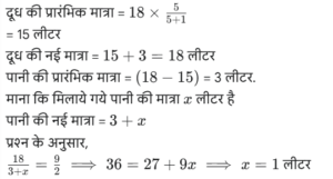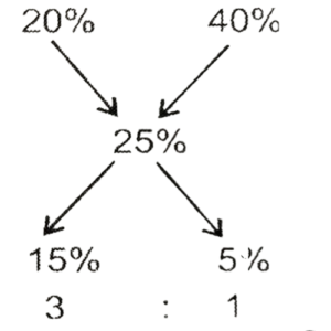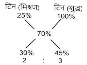 मिश्रण और पृथकीकरण (भाग-I)Total Questions: 5041. तांबे और टिन के 750 kg मिश्रधातु के मिश्रण में 25% टिन है। कितना टिन मिलाया जाना चाहिए ताकि यह मिश्रण का 70% हो जाए ? [ SSC CPO 27/06/2024 (2nd Shift)](a) 895 kg(b) 1125 kg(c) 956 kg(d) 1097 kgCorrect Answer: (b) 1125 kgSolution:42. मिश्र धातु A और B में, लेड और टिन का अनुपात क्रमशः 5 : 3 और 3 : 1 है। एक नई मिश्र धातु बनाने के लिए, 80 kg मिश्र धातु A और 100 kg मिश्र धातु B को एक साथ मिलाया जाता है। नई मिश्र धातु में टिन की मात्रा (kg में) कितनी होगी? [SSC CPO 27/06/2024 (3rd Shift)](a) 90(b) 55(c) 68(d) 81.3Correct Answer: (b) 55Solution:43. एक बर्तन में 51 के अनुपात में दूध और पानी का 18 लीटर मिश्रण है। यदि बर्तन में 3 लीटर दूध मिलाया जाता है, तो बर्तन में कितना पानी (लीटर में) मिलाया जाना चाहिए ताकि दूध और पानी का अनुपात 9 : 2 हो जाए? [SSC CPO 28/06/2024 (3rd Shift)](a) 2(b) 1.5(c) 0.5(d) 1Correct Answer: (d) 1Solution:44. एक मिश्र धातु में धातु A, B और C का अनुपात 2 : 3 : 1 है और दूसरी मिश्रधातु में धातु B, C और D का अनुपात 5 : 4 : 3 है। यदि दोनों मिश्र धातुओं के बराबर वजन को एक साथ मिलाकर एक तीसरी मिश्रधातु बनाई जाती है, तो नई मिश्रधातु में धातु में B का कितना भाग होगा? [SSC CPO 29/06/2024 (3rd Shift)](a) 1/8(b) 1/6(c) 3/24(d) 11/24Correct Answer: (d) 11/24Solution:अनुपात → A : B : C : Dमिश्रधातु₁ → 2 : 3 : 1 ) ×2मिश्रधातु₂ → : 5 : 4 : 3समान वजन के लिए, अनुपात → A : B : C : Dमिश्रधातु₁ → 4 : 6 : 2मिश्रधातु₂ → : 5 : 4 : 345. एक रसायन प्रयोगशाला फेरस सल्फेट के 25% विलयन के लिए अनुरोध करती है। एक आपूर्तिकर्ता के पास 20% विलयन का 40 मिलीलीटर है। इसे 25% विलयन बनाने के लिए 40% विलयन के कितने मिलीलीटर (दो दशमलव स्थानों तक सही) मिलाए जाने चाहिए ? [Matriculation Level 20/06/2024 (Shift - I)](a) 16.40(b) 15.20(c) 13.33(d) 14.30Correct Answer: (c) 13.33Solution:मिश्रण विधि का उपयोग करके :-46. समान धारिता के दो कंटेनर दूध और पानी के मिश्रण से भरे हुए हैं। पहले में, दूध और पानी का अनुपात 3 : 7 है और दूसरे में 7 : 9 है।। अब दोनों मिश्रणों को एक बड़े कंटेनर में मिलाया जाता है। दूध और पानी का परिणामी अनुपात क्या है? [Matriculation Level 24/06/2024 (Shift - I)](a) 59 : 101(b) 57 : 107(c) 61 : 97(d) 58 : 103Correct Answer: (a) 59 : 101Solution:दूध : पानी : कुलपहला मिश्रण → (3 : 7 : 10) × 824 : 56 : 80दूसरा मिश्रण → (7 : 9 : 16) × 535 : 45 : 80अंतिम मिश्रण → 59 : 10147. दो किस्म के चावल हैं। किस्म 1 वाले चावल की कीमत ₹20 प्रति kg और किस्म 2 वाले काकरण चावल की कीमत ₹25 प्रति kg है। दोनों चावलों को 2 : 3 के अनुपात में मिला दिया जाता है। मिश्रित चावल की कीमत प्रति kg (₹ में) ज्ञात कीजिए। [Matriculation Level 24/06/2024 (Shift - 4)](a) 23(b) 23.50(c) 22(d) 22.50Correct Answer: (a) 23Solution:मात्रा 2 : 3 कीमत/किग्रा 20 : (20 + 5) मिश्रित चावल की कीमत48. एक पंसारी द्वारा बेचे जाने वाले चावल में 20% निम्न-गुणवत्ता वाले चावल हैं। 175 kg मिश्रित चावल में कितनी मात्रा में अच्छी गुणवत्ता वाले चावल मिलाए जाने चाहिए ताकि निम्न गुणवत्ता वाले चावल का प्रतिशत 10% बना रहे ? [Matriculation Level 24/06/2024 (Shift - 4)](a) 175 kg(b) 150 kg(c) 100 kg(d) 125 kgCorrect Answer: (a) 175 kgSolution:एलीगेशन विधि का उपयोग करते हुए, हमारे पास है;1 इकाई ⟶ 175 kgतो, अच्छी गुणवत्ता वाले चावल की आवश्यक मात्रा= 175 kg49. 84 लीटर के एक मिश्