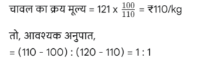 6. दो किस्म के चावल है। किस्म 1 का मूल्य ₹100 प्रति किलोग्राम और किस्म 2 का मूल्य ₹120 प्रति किलोग्राम है। विक्रेता ने दोनों किस्मों को मिलाकर उन्हें ₹121 प्रति किलोग्राम पर बेच दिया और 10% का लाभ कमाया। मिश्रण में किस्म 1 ओर किस्म 2 के चावल का अनुपात ज्ञात कीजिए। [SSC MTS 08/09/2023 (1st Shift)]