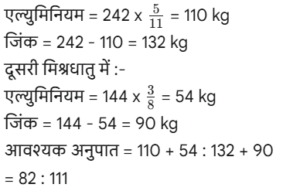 9. दो मिश्र धातुओं में, एल्युमिनियम और ज़िंक का अनुपात 5 : 6 और 35 है। यदि पहली मिश्रधातु के 242 kg और दूसरी मिश्रधातु के 144 kg को आपस में मिलाया जाए, तो नई मिश्रधातु में एल्युमिनियम और जिंक का अनुपात क्या है ? [SSC CHSL 07/08/2023 (4th Shift)]
