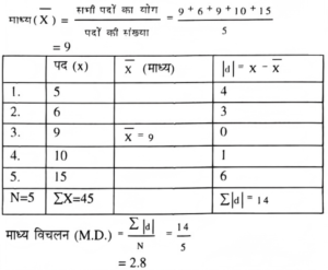 जबकि माध्य एक भारित औसत है। इसकी गणना वितरण में सभी अंकों से की जाती है। माध्य विचलन सरण का मापन है और इसे औसत से विचलन का योग (चिन्ह को अनदेखा कर) को वितरण मदों की संख्या से विभाजित कर प्राप्त अंक के रूप में परिभाषित किया गया है।