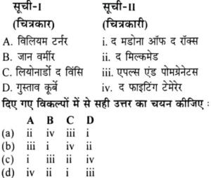 Solution:* विलियम टर्नर के प्रसिद्ध चित्र- द फ्राइटिंग टेमेरेर, चाँदनी रात्रि का आध्ययन, लाइबर स्टूडियों, कोहरे में से उगता सूर्य, डीडो बिल्डिंग कार्थेज, बेर्या की खाड़ी आदि।