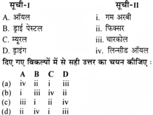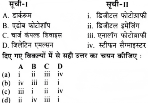 यू.जी.सी. NTA नेट (जुलाई) परीक्षा, 2019 (दृश्य कला)Total Questions: 10051. निम्नलिखित कलाकारों का सही क्रम चुनिएः1. कृष्णा आहूजा 3. कंचन चंद्रा 2. ज्योति भट्ट 4. अनुपम सूद सही क्रम है:(a) 2, 1, 4, 3(b) 2, 4, 3, 1(c) 2, 1, 3,4(d) 1, 2, 3,4Correct Answer: (a) 2, 1, 4, 3Solution:ज्योति भट्ट (1934), कृष्णा आहूजा (1943), अनुपम सूद (1944), कंचन चंद्रा (1957)।52. सूची-1 को सूची-11 सुमेलित करें -(a)(b)(c)(d)(e) *Correct Answer: (e) *Solution:NTA ने उत्तर नही दिया 53. विश्व का सबसे बड़ा 'म्यूजियम ऑफ अप्लाइड एंड डेकोरेटिव आटर्स एंड डिजाइन' है।(a) दि विक्टोरिया एंड अल्बर्ट म्यूजियम, लंदन(b) ऑस्ट्रियन म्यूजियम ऑफ अप्लाइड आटर्स एंड कन्टेम्परी आर्ट(c) म्यूजियम ऑफ फाइन आटर्स, बोस्टन(d) लून म्यूजियम, पेरिस, फ्रांसCorrect Answer: (a) दि विक्टोरिया एंड अल्बर्ट म्यूजियम, लंदनSolution:विश्व का सबसे बड़ा "म्यूजियम ऑफ अप्लाइड एंड डोकोरेटिव आटर्स एंड डिजाइन" है "दि विक्टोरिया एंड अल्वर्ट म्यूजियम, लंदन । मार्शेल धुंशा का प्रसिद्ध चित्र "जीने से उतरती हुई नग्नाकृति" फिलाडेल्फिया म्यूजियम आर्ट (यू.एस.ए.) में है। कुर्बे का प्रसिद्ध चित्र "ओर्ना का दफन संस्कार “म्यूसी द आर्साय, पेरिस (फ्रांस) में है। पाल गोंग्व का प्रसिद्ध चित्र "हम कहां से आते हैं? हम क्या है....? हम कहां जा रहे है....? म्यूजियम आफ फाइन आर्ट्स, बोस्टन (यू.एस.यू.) में है।54. कैलिग्राफी किससे संबधित दृश्य कला है?(a) ड्राइंग(b) पेंटिंग(c) राइटिंग(d) एचिंगCorrect Answer: (c) राइटिंगSolution:कैलिग्राफी "राइटिंग से संबंधित दृश्य कला है। कापर व जस्ते की चादर का प्रयोग "एचिंग" तकनीक में होता है। रंग खुरचकर रेखांकन करने वाली पद्धति को "एण्टीक्रीन" कहते है। मोम द्वारा भित्तिचित्रण विधि को "एनकॉस्टिक" कहते है। “प्रीसेस" तकनीक का संबंध मुद्रण से है। डिजिटल टेक्सटाइल प्रिंटिंग में "इंक जेट पद्धति" प्रयोग होता है।55. खराब तरीके से कैलिब्रेट किए गए मॉनिटर के सबसे सामान्य परिणाम दिखाई देते हैं?(a) प्रत्येक पिक्सेल के लिए आर.बी. वैल्यूज(b) ऑन स्क्रीन डिस्प्ले(c) वीडियो(d) प्रिंट्सCorrect Answer: (d) प्रिंट्सSolution:"प्रिंट्स" में खराब तरीके से कैलिब्रेट किए गये मॉनिटर के सबसे सामान्य परिणाम दिखाई देते है। प्रिंटमेकर विशेष रूप से बुडकट और लकडी इन्विंग तकनीक के लिये याद किये जाते है। एचिंग का आविष्कार जर्मनी के डेनियल हॉफर ने 1515 ई. में किया।56. 'मैरिज फोटो' किसका प्रिंट है?(a) आर.बी. भास्करन(b) अजीत केसरी(c) मंजीत बावा(d) उमेश वर्माCorrect Answer: (a) आर.बी. भास्करनSolution:"मैरिज फोटो" आर. वी. भास्करन का प्रिंट है। राजन फुलेरी "प्रिंटमेकिंग' विद्या के माहिर कलाकार है। भारत में "कोलाज प्लेट प्रिंटिंग" प्रक्रिया कंवल कृष्ण ने आरंभ की मंजीत बाबा ने "सिल्क स्क्रीन प्रिंटिंग" का अध्ययन लंदन स्कूल ऑफ प्रिंटिंग से किया 1964 से 1971 ई. के बीच मंजीत बाबा ने ब्रिटेन में "सिल्कस्क्रीन प्रिंटिर" के रूप में कार्य