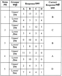 बैंडमिंटन के विभिन्न पहलुओं जैसे प्रविधियाँ, कार्यनीति एवं मनोवैज्ञानिक पक्षों पर 60 विषयों पर एक ज्ञान परीक्षा संपादित की गयी। उत्तर सहित 5 बहु-विकल्पी परीक्षण मदें (अर्थात् A, B, C और D) हैं, प्रत्येक परीक्षण मदों के सही उत्तर और प्रत्येक परीक्षण मद के लिए 27% की उच्च एवं निम्न समूह (प्रत्येक समूह में 16 परीक्षण अंक) प्रत्येक परीक्षण मद के मद विश्लेषण के उद्देश्य हेतु नीचे सारणी में दिया गया है।
