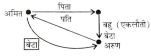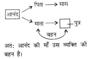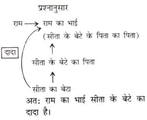रक्त संबंध Type-II (प्रश्न 101-150)Total Questions: 5021. एक तस्वीर की तरफ देखते हुए, रमेश ने कहा, "यह राहुल है, मेरे भाई के पुत्र के इकलौते चाचा की पत्नी का भाई है।" ....... ? [रेलवे NTPC CBT स्टेज-I परीक्षा (स्नातक स्तरीय), 02.04.2016 तृतीय पाली](A) साला(B) भाई(C) चचेरा भाई(D) बेटा(1) A(2) C(3) B(4) DCorrect Answer: (1) ASolution:22. गणेश ने कहा, अंजलि मेरे दादा की एकमात्र बहू की पोती है। "गणेश अविवाहित है और उसकी एक ही बड़ी बहन है।" गणेश अंजलि से किस प्रकार संबंधित है ? [रेलवे NIPC CBT स्टेज-I परीक्षा (स्नातक स्तरीय). 02.04.2016 तृतीय पाली](A) मामा(B) चाचा(C) भाई(D) भतीजा(1) A(2) C(3) B(4) DCorrect Answer: (1) ASolution:23. किट्टी ने कहा, "उत्तरा मेरी माँ के भाई की पत्नी की दो बेटियों में से एक है।" किट्टी की माँ से उत्तरा की बहन से किस तरह संबंधित है ? [रेलवे NTPC CBT स्टेज-I परीक्षा (स्नातक स्तरीय), 03.04.2016 प्रथम पाली](A) मामी(B) माँ(C) दादी (Grandmother)(D) बहन(1) A(2) B(3) C(4) DCorrect Answer: (2) BSolution:24. सीता ने कहा, "राम का इकलौता भाई मेरे बेटे के पिता का पिता है" राम का भाई सीता के बेटा से कैसे संबंधित है ? [रेलवे NTPC CBT स्टेज-I परीक्षा (स्नातक स्तरीय), 03.04.2016 द्वितीय पाली](A) पिता(B) दादा(C) मामा(D) चाचा(1) C(2) B(3) A(4) DCorrect Answer: (2) BSolution:25. एक तस्वीर को देखते हुए, आनंद ने कहा, "यह आदमी मेरे पिता की सास का ज्येष्ठ पुत्र है।" आनंद की माँ इस आदमी से कैसे संबंधित है ? [रेलवे NTPC CBT स्टेज-I परीक्षा (स्नातक स्तरीय), 03.04.2016 द्वितीय पाली](A) माँ(B) बेटी(C) मामी (Maternal Aunt)(D) बहन(1) B(2) A(3) C(4) DCorrect Answer: (4) DSolution:26. अमित ने अरुण का परिचय अपने पिता की इकलौती बहू के बेटे के रूप में कराया। अरुण अमित से कैसे संबंधित है ? [रेलवे NTPC CBT स्टेज-I परीक्षा (स्नातक स्तरीय), 03.04.2016 तृतीय पाली](A) पोता (Grandson)(B) भतीजा (Nephew)(C) बेटा (Son)(D) चाचा (Uncle Patemal)(1) D(2) B(3) C(4) ACorrect Answer: (3) CSolution:27. अंकित ने शीला का अपने बेटे के दादा की एकमात्र बहन के रूप में परिचय करवाया। शीला अंकित से कैसे संबंधित है ? [रेलवे NTPC CBT स्टेज-I परीक्षा (स्नातक स्तरीय), 03.04.2016 तृतीय पाली](A) माँ(B) बुआ (Paternal Aunt)(C) बहन(D) बेटी(1) D(2) B(3) C(4) ACorrect Answer: (2) BSolution:28. अब्राहम की माँ जॉन की माँ की इकलौती बेटी है। जॉन रोजी का पति है। जॉन अब्राहम से कैसे संबंधित है ? [रेलवे NTPC CBT स्टेज-I परीक्षा (स्नातक स्तरीय). 04.04.2016 द्वितीय पाली](A) पिता(B) दादा (Grandfather)(C) मामा (Maternal Uncle)(D) भाई(1) A(2) D(3) C(4) BCorrect Answer: (3) CSolution:29. आदिल ने कहा, "वह औरत मेरे भतीजे के पिता की माँ की इकलौती बहू है।" अमर आदिल का केवल एक ही भाई है, तो वह औरत आदिल से किस प्रकार से संबंधित है ? [रेिलवे NTPC CBT स्टेज-I परीक्षा (स्नातक स्तरीय), 04.04.2016 तृतीय पाली](A) बहन(B) माँ(C) भांजी (Niece)(D) भाभी (Sister-in-law)(1) B(2) A(3) C(4) DCorrect Answer: (4) DSolution:30. अनीता ने एक व्यक्ति का परिचय अपनी माँ के भाई के पुत्र के रूप में कराया। उस व्यक्ति के साथ अनीता किस प्रकार संबंधित है ? [रेलवे NTPC CBT स्टेज-I परीक्षा (स्नातक स्तरीय), 07.04.2016 द्वितीय पाली](A) चचेरी/ममेरी/मोसेरी बहन(B) बहन(C) चाची/मामी(D) भाभी(1) A(2) B(3) D(4) CCorrect Answer: (1) ASolution:Submit Quiz« Previous12345Next »
