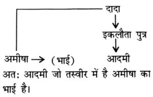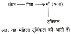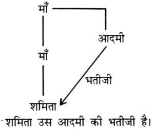 रक्त संबंध Type-II (प्रश्न 151-200)Total Questions: 5041. एक आदमी का परिचय देते हुए, शमिता ने कहा, "वह मेरी माँ की माँ का एकमात्र पुत्र है।" शमिता उस आदमी से किस तरह से संबधित हैं ? [RRB NTPC CBT Stage-I परीक्षा, 27.04.2016 (तृतीय पाली)](A) माँ (B) चाची (Aunt) (C) बहन (D) भतीजी/भांजी (Niece)(1) D(2) B(3) A(4) CCorrect Answer: (1) DSolution:42. हेमंत ने नैतिक से कहा, 'वह लड़का जो फुटबॉल से खेल रहा है वह मेरे पिता की पत्नी की बेटी के दो भाईयों में से छोटा है।' फुटबॉल खेल रहा लड़का हेमंत से किस तरह संबंधित है ? [RRB NTPC CBT Stage-I परीक्षा, 29.04.2016 (द्वितीय पाली)](A) बेटा (B) भाई (C) चेचरा (D) भतीजा(1) A(2) C(3) B(4) DCorrect Answer: (3) BSolution:43. मेट्रो में एक महिला को दिखाते हुए, ट्विंकल ने कहा, "वह मेरी माँ के बेटे के पिता की बहन है।" वह महिला ट्विंकल की कौन है ? [RRB NTPC CBT Stage-I परीक्षा, 29.04.2016 (द्वितीय पाली)](A) माँ (B) बहन (C) आंटी/बुआ (D) भतीजी/भाजी(1) D(2) B(3) C(4) ACorrect Answer: (3) CSolution:44. एक तस्वीर की तरफ ईशारा करते हुए अमीषा ने कहा, वह मेरे दादा के इकलौते बेटे का बेटा है। तस्वीर के उस आदमी का अमीषा से क्या संबंध है। [RRB NTPC CBT Stage-I परीक्षा, 29.04.2016 (तृतीय पाली)](A) भाई (B) चाचा (C) बेटा (D) पिता(1) D(2) B(3) C(4) ACorrect Answer: (4) ASolution:45. एक आदमी की तरफ ईशारा करते हुए नयन ने कहा, इसका इकलौता भाई मेरी बेटी के पिता का पिता है- आदमी और नयन का क्या संबंध हैं ? [RRB NTPC CBT Stage-I परीक्षा, 29.04.2016 (तृतीय पाली)](A) पिता (B) दादा (C) चाचा (D) देवर(1) D(2) A(3) C(4) BCorrect Answer: (3) CSolution:46. आरूषी का परिचय देते हुए अजय ने कहा, यह मेरी माता के इकलौते भाई के इकलौते भांजे की पत्नी है। आरूषी का अजय से क्या संबंध है। [RRB NTPC CBT Stage-I परीक्षा, 29.04.2016 (तृतीय पाली)](A) पत्नी (B) बहन (C) साली (D) सास(1) C(2) B(3) D(4) ACorrect Answer: (4) ASolution:47. दीपक राजू का परिचय कराते हुए कहता है, "वह मेरे पिता के पिता की पोती का पति है"। राजू किस प्रकार दीपक से संबंधित है ? [RRB NTPC CBT (मुख्य) परीक्षा, 17.01.2017 (प्रथम पाली)](1) दामाद(2) जीजा/साला(3) पुत्र(4) भाईCorrect Answer: (2) जीजा/सालाSolution:दीपक के पिता के पिता का अर्थ हुआ दीपक के दादाजी। दीपक के दादाजी की पोती दीपक की बहन या चचेरी बहन होगी। अतः, राजू जीजा है दीपक का।48. अरुण ने कहा, "वह महिला मेरी माता के भाई की माता की इकलौती पुत्री की पुत्री है।" वह महिला किस प्रकार अरुण से संबंधित है ? [RRB NTPC CBT (मुख्य) परीक्षा, 18.01.2017 (तृतीय पाली)](1) दादी/नानी(2) माता(3) पत्नी(4) बहनCorrect Answer: (4) बहनSolution:अरुण की माता के भाई की माता की इकलौती पुत्री की पुत्री का अर्थ हुआ अरुण की बहन।अरुण की माता के भाई की माता का अर्थ हुआ अरुण की नानी।अरुण की नानी की इकलौती पुत्री का अर्थ हुआ अरुण की माता।अरुण की माता की पुत्री का अर्थ हुआ अरुण की बहन।49. अरुण पिता है चित्रा का, तथा दिनेश पुत्र है भावना का। मनीष भाई है अरुण का। यदि चित्रा बहन है दिनेश की, तो भावना किस प्रकार मनीष से संबंधित है ? [RRB NTPC CBT (मुख्य) परीक्षा, 19.01.2017 (तृतीय पाली)](1) पुत्री(2) बहन(3) सास(4) भाभी/ननद/सालीCorrect Answer: (4) भाभी/ननद/सालीSolution:मनीष भाई है अरुण का। 