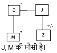 4. "A = B" का अर्थ है कि "A, B का पिता है"। "A $ B" का अर्थ है कि "A, B की बहन है"। "A * B" का अर्थ है कि "A, B की माता है"। "A ? B" का अर्थ है कि "A, B का पुत्र है"। यदि M ? C $ J * Z है, तो J का M से क्या संबंध है? [SSC CPO 03/10/2023 (1st Shift)]