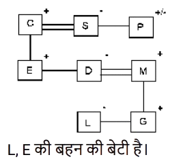 7. L, G की बहन है। G, M का बेटा है। M का विवाह D से हुआ है। D, E की बहन है। E, C का बेटा है। C का विवाह S से हुआ है। S, P की बहन है। L का E से क्या संबंध है? [SSC CHSL 02/08/2023 (1st Shift)]