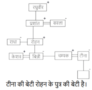 5. राधा अपने भाई रोहन से मिलने जाती है, जो अपने पिता प्रशांत, माता सरला और दादा रघुवीर के साथ रहता है। रोहन के दो बच्चे बिन्नी और चंपक हैं। बिन्नी के पति केशव और चंपक की पत्नी टीना हैं। टीना की पुत्री ने राधा को उनका घर ढूंढने में मदद की। टीना की पुत्री का रोहन से क्या संबंध है? [Higher Secondary 21/06/2024 (Shift - 2)]