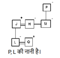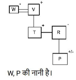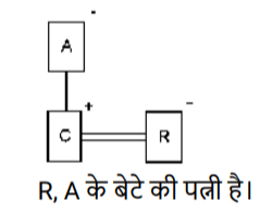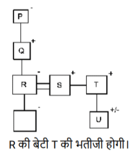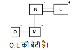रक्त सम्बन्ध (भाग-III)Total Questions: 5011. एक निश्चित कूट भाषा में, ‘A + B’ का अर्थ है ‘A, B की पत्नी है' ‘A – B’ का अर्थ है ‘A, B की बहन है' ‘A × B’ का अर्थ है ‘A, B की माता है' ‘A ÷ B’ का अर्थ है ‘A, B की पुत्री है [Higher Secondary 25/06/2024 (Shift - 4)]उपरोक्त के आधार पर, यदि ‘O − M ÷ N + L’ है, तो O का L से क्या संबंध है?(a) पुत्री(b) बहन(c) बहू(d) माताCorrect Answer: (a) पुत्रीSolution:12. एक निश्चित कूट भाषा में, 'M & N' का अर्थ है, ‘M, N की माँ है', 'M @ N' का अर्थ है, 'M, N का पुत्र है', 'M # N' का अर्थ है, ‘M, N की पुत्री है'। [Higher Secondary 25/06/2024 (Shift - 4)]उपरोक्त के आधार पर, यदि 'K & L & M # N @ O' है, तो L, O से किस प्रकार संबंधित है?(a) पुत्री(b) पुत्र की पत्नी(c) बहन(d) भाई की पत्नीCorrect Answer: (b) पुत्र की पत्नीSolution:13. एक निश्चित कूट भाषा में, A + B का अर्थ है 'A, B की माता है' A – B का अर्थ है 'A, B का भाई है' A × B का अर्थ है 'A, B की पत्नी है' A # B का अर्थ है 'A, B का पिता है' [Graduate Level 20/06/2024 (Shift - 3)]उपर्युक्त के आधार पर, यदि ‘W – V + T # R × S – P’ है, तो W का P से क्या संबंध है ?(a) भाई की पत्नी के पिता की माता का भाई(b) पत्नी के पिता की माता का भाई(c) पत्नी के पिता की माता का पिता(d) भाई की पत्नी के पिता की माता का पिताCorrect Answer: (a) भाई की पत्नी के पिता की माता का भाईSolution:अतः W, P के भाई की पत्नी के पिता की माता का भाई है।14. एक निश्चित कूट भाषा में, 'A + B' का अर्थ है कि 'A, B की माँ है', 'A − B' का अर्थ है कि 'A, B का भाई है', 'A × B' का अर्थ है कि 'A, B की पत्नी है', 'A ÷ B' का अर्थ है कि 'A, B का पिता है' [Graduate Level 20/06/2024 (Shift - 3)]यदि 'P + Q ÷ R × S − T ÷ U' है तो उपरोक्त जानकारी के आधार पर, R की पुत्री का T से क्या संबंध है?(a) भतीजी(b) भाभी(c) भतीजा(d) पिताCorrect Answer: (a) भतीजीSolution:15. एक निश्चित कूट भाषा में, A + B का अर्थ है 'A, B की माता है' A - B का अर्थ है 'A, B का भाई है' A × B का अर्थ है 'A, B की पत्नी है' A# B का अर्थ है 'A, B का पिता है' [Graduate Level 24/06/2024 (Shift - 3)]उपर्युक्त के आधार पर, यदि 'W × V #T - R + P' है, तो W का P से क्या संबंध है?(a) माता(b) बहन(c) नानी(d) मौसीCorrect Answer: (c) नानीSolution:16. R, Q का पुत्र है। M, B का भाई है, जो Q की पुत्री हैऔर P की माता है। M, R से किस प्रकार संबंधित है? [Graduate Level 24/06/2024 (Shift - 3)](a) भाई(b) पिता(c) भांजा/भतीजा(d) पतिCorrect Answer: (a) भाईSolution:17. आयुष ने नेहा से कहा, "मैं भले ही तुम्हारे पिता का बेटा हूं, लेकिन तुम मेरे भाई नहीं हो"। नेहा का आयुष से क्या संबंध है? [Graduate Level 25/06/2024 (Shift - 3)](a) पुत्री(b) सौतेली पुत्री(c) बहन(d) कजनCorrect Answer: (c) बहनSolution:18. एक निश्चित कूट भाषा में, 'A + B' का अर्थ है कि 'A, B की माँ है', 'A - B' का अर्थ है कि 'A, B का भाई है', 'A × B' का अर्थ है कि 'A, B की पत्नी है', 'A ÷ B' का अर्थ है कि 'A, B का पिता है'। [Graduate Level 26/06/2024 (Shift - 4)](a) साली(b) सास(c) साला(d) ससुरCorrect Answer: (d) ससुरSolution:19. L, Q की पत्नी है। P, M की माता है। J, L का पिता है। M, H की बहन है। J, H का पति है। P का L से क्या संबंध है? [SSC CPO 03/10/2023 (1st Shift)](a) मौसी(b) भांजा(c) नानी(d) बहनोईCorrect Answer: (c) नानीSolution:20. "M $ K" का अर्थ है कि "M, K की माता है"। "M # K" का अर्थ है कि "M, K का पिता है"। "M @ K" का अर्थ है कि "M, K का पति है"। "M % K" का अर्थ है कि "M, K की पुत्री है"। [SSC CPO 03/10/2023 (