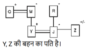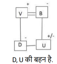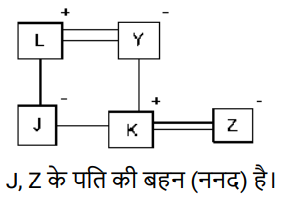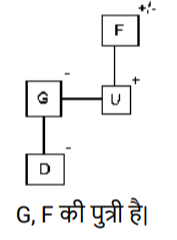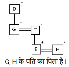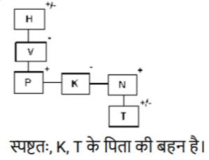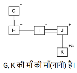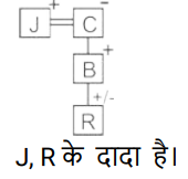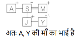 रक्त सम्बन्ध (भाग-III)Total Questions: 5021. A @ B का अर्थ है "A, B का पति है" A & B का अर्थ है "A, B की माता है" A # B का अर्थ है "A, B की पुत्री है" [SSC CPO 03/10/2023 (2nd Shift)](a) पिता(b) बुआ(c) भाभी(d) बहनोईCorrect Answer: (d) बहनोईSolution:22. A @ B का अर्थहै “A, B का पति है" “A & B का अर्थ है “A, B की माता है" A # B का अर्थ है “A, B की पुत्री है" [SSC CPO 03/10/2023 (3rd Shift)]यदि D & G @ F & E @ H है, तो G का H से क्या संबंध है?(a) पिता(b) सास(c) माता(d) ससुरCorrect Answer: (d) ससुरSolution:23. 'A ? B' का अर्थ है की 'A, B का पुत्र है’ I 'A $ B' का अर्थ है की 'A, B की पुत्री है' I 'A * B' का अर्थहैकी 'A, B का भाई है' I 'A = B' का अर्थ है की 'A, B का पिता है' I [SSC CPO 04/10/2023 (1st Shift)]यदि H $ Q * Y * N, है , Y का H से क्या संबंध है(a) दादा(b) भाई(c) चाचा/ताऊ(d) पिताCorrect Answer: (c) चाचा/ताऊSolution:24. F $ G' का अर्थ है कि 'F, G की माता है' 'F # G' का अर्थ है कि F, G का पिता है' 'F @ G' का अर्थ है कि F, G का पति है' 'F % G' का अर्थ है कि F, G की पुत्री है' [SSC CPO 04/10/2023 (2nd Shift)]यदि J @ C $ B # R है, तो J का R से क्या संबंध है ?(a) मामा(b) बुआ(c) पिता(d) दादाCorrect Answer: (d) दादाSolution:25. "P $ Q" का अर्थ है "P, Q की पुत्री है" "P ? Q" का अर्थ है "P, Q का पुत्र है" "P * Q" का अर्थ है "P, Q की बहन है" "P = Q" का अर्थ है "P, Q का पिता है" [SSC CPO 04/10/2023 (3rd Shift)]यदि 'D $ G * U ? F' है, तो G का F से क्या संबंध है?(a) बुआ(b) पुत्री(c) भाई(d) मौसीCorrect Answer: (b) पुत्रीSolution:26. "Z @ A" का अर्थ है "Z, A का पुत्र है"। "Z * A" का अर्थ है "Z, A का भाई है"। "Z × A" का अर्थ है "Z, A के पिता है"। "Z # A" का अर्थ है "Z, A की बहन है"। "Z $ A " का अर्थ है "Z, A की पुत्री है"। "Z = A" का अर्थ है "Z, A की माता है। [SSC CPO 05/10/2023 (1st Shift)]निम्नलिखित व्यंजक में A का Y से क्या संबंध है? A * S = J @ M × Y(a) A, Y के पिता है।(b) A, Y का भाई है।(c) A, Y का चचेरा/ममेरा/फुफेरा/मौसेरा भाई बहन है।(d) A, Y की माता का भाई है।Correct Answer: (d) A, Y की माता का भाई है।Solution:27. A@B का अर्थ 'A ,B का पति है’ A & B का अर्थ 'A ,B की माता है ’, A# B का अर्थ 'A, B की पुत्री है,’ [SSC CPO 05/10/2023 (2nd Shift)]यदि J # L@Y & K@Z, तो J का Z से क्या संबध है ?(a) ननद(b) भाभी(c) माता(d) बहनोईCorrect Answer: (a) ननदSolution:28. Q + J का अर्थ है "Q, J का पति है" Q – J का अर्थ है "Q, J का पिता है" Q × J का अर्थ है "Q, J की माता है" Q * J का अर्थ है "Q, J की पुत्री है" [SSC CPO 05/10/2023 (3rd Shift)](a) माता(b) बहन(c) भाई(d) पुत्रीCorrect Answer: (b) बहनSolution:29. एक निश्चित कूट भाषा में, A + B का अर्थ 'A, B का पिता है', A – B का अर्थ 'A, B की पत्नी है' A × B का अर्थ 'A, B का भाई है' A ÷ B का अर्थ 'A, B की मां है' [SSC CHSL 02/08/2023 (1st Shift)]उपरोक्त के आधार पर, यद 'G ÷ H × I − J + K " है, तो G का K से क्या संबंध है?(a) मां की मां(b) पिता की बहन(c) मां(d) पिता की मांCorrect Answer: (a) मां की मांSolution:30. V, P की माँ है। P, K का भाई है। K के भाई N की केवल एक संतान T है। K, H की इकलौती पोती है। K का T से क्या संबंध है? [SSC CHSL 02/08/2023 (3rd Shift)](a) पिता की माँ(b) माँ(c) बहन(d) पिता की बहनCorrect Answer: (d) पिता की बहनSolution:Submit Quiz« Previous12345Next »