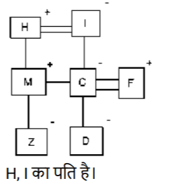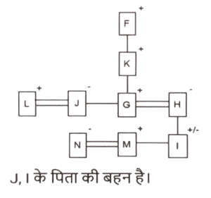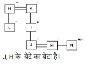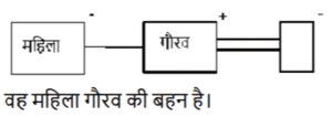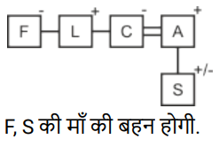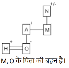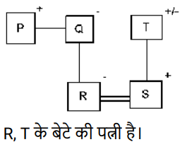रक्त सम्बन्ध (भाग-III)Total Questions: 5041. एक निश्चित कूट भाषा में, A + B का अर्थ 'A, B का बेटा है', A - B का अर्थ 'A, B की पत्नी है', A × B का अर्थ 'A, B का भाई है', A ÷ B का अर्थ 'A, B की मां है' | [SSC CHSL 09/08/2023 (1st Shift)]उपर्युक्त के आधार पर, यदि 'P × Q ÷ R - S + T' है, तो R का T से क्या संबंध है?(a) बेटेकी पत्नी(b) बेटी(c) मां का भाई(d) भाईCorrect Answer: (a) बेटेकी पत्नीSolution:42. एक निश्चित कूट भाषा में, A & B का अर्थ है A, B की पत्नी है, A / B का अर्थ है A, B का भाई है, A × B का अर्थ है A, B की बहन है, A - B का अर्थ है कि A, B का पिता है। [SSC CHSL 09/08/2023 (2nd Shift)]उपरोक्त के आधार पर, L / M × D - K में L का K से क्या संबंध है?(a) पिता(b) माँकी बहन(c) माँ(d) पिता का भाईCorrect Answer: (d) पिता का भाईSolution:43. एक निश्चित कूट भाषा में, A + B का अर्थ 'A, B की बेटी है', A - B का अर्थ 'A, B का भाई है’, A × B का अर्थ 'A, B का बेटा है' और A ÷ B का अर्थ 'A, B का पति है'। [SSC CHSL 09/08/2023 (3rd Shift)]उपरोक्त के आधार पर, यदि ‘H ÷ O + A - M + N' है, तो M का O से क्या संबंध है?(a) पिता की पत्नी(b) पिता की मां(c) पिता की बहन(d) भाई की मांCorrect Answer: (c) पिता की बहनSolution:44. K. S की बेटी है। S की शादी G से हुई है। A, M का इकलौता पोता है। G, M का बेटा है। A की एक बेटी H है, जो S की इकलौता पोती है। K का A से क्या संबध है? [SSC CHSL 10/08/2023 (1st Shift)](a) बहन(b) मां की मां(c) बेटी(d) मां की बहनCorrect Answer: (a) बहनSolution:45. एक निश्चित कूट भाषा में, A + B का अर्थ 'A, B की पत्नी है', A − B का अर्थ 'A, B का पिता है', A × B का अर्थ 'A, B का भाई है', और A ÷ B का अर्थ 'A, B की बहन है' । [SSC CHSL 10/08/2023 (3rd Shift)]उपरोक्त के आधार पर, यदि '𝐹 ÷ 𝐿 × 𝐶 + 𝐴 − 𝑆 ‘ है, तो F, का S से क्या संबंध है ?(a) भाई की बेटी(b) मां की मां(c) मां की बहन(d) पिता की बहनCorrect Answer: (c) मां की बहनSolution:46. अपने बगल में बैठी एक महिला को देखकर गौरव ने कहा, "यह मेरी पत्नी के पति की बहन है।" महिला का गौरव से क्या संबंध है? [SSC CHSL 11/08/2023 (1st Shift)](a) बेटी(b) माँ(c) पत्नी की बहन(d) बहनCorrect Answer: (d) बहनSolution:47. P, C का बेटा है। C का विवाह D से हुआ है। D, O की बहन है। O, M की बेटी है। X, C की माँ है और W से विवाहित है। P का W से क्या संबंध है ? [SSC CHSL 11/08/2023 (3rd Shift)](a) बेटेका बेटा(b) भाई का बेटा(c) बहन का बेटा(d) बेटी का बेटाCorrect Answer: (a) बेटेका बेटाSolution:48. H, M का पिता है। M, C का भाई है। C, I की बेटी है और F से विवाहित है। D, C की बेटी है। Z, M की बेटी है। H का I से क्या संबंध है ? [SSC CHSL 11/08/2023 (4th Shift)](a) पति(b) बहन(c) भाई(d) बेटाCorrect Answer: (a) पतिSolution:49. L, H की बेटी है। H का विवाह K से हुआ है। K,। की मां है। ।, J का पिता है। J का विवाह M से हुआ है। M, N की बहन है। J का H से क्या संबंध है ? [SSC CHSL 14/08/2023 (1st Shift)](a) भाई का बेटा(b) बेटी का बेटा(c) बेटेका बेटा(d) बेटाCorrect Answer: (c) बेटेका बेटाSolution:50. F, G के पिता का पिता है। G, H से विवाहित है। H, I की मां है। J, G की बहन है। K, J का पिता है। J, L से विवाहित है, M, I का भाई है और N से विवाहित है। J का I से क्या संबंध है ? [SSC CHSL 14/08/2023 (2nd Shift)](a) पिता की बहन(b) बहन(c) पिता का भाई(d) मां की मांCorrect Answer: (a) पिता की बहनSolution:Submit Quiz« Previous12345
