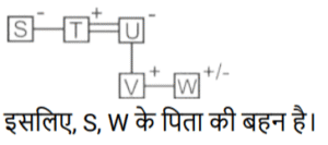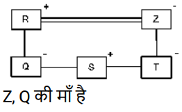 रक्त सम्बन्ध (भाग-IV)Total Questions: 501. एक निश्चित कूट भाषा में, ‘A + B’ का अर्थ 'A, B का पति है' ‘A – B ‘का अर्थ 'A, B की मां है' ‘A × B’ का अर्थ 'A, B की बहन है', ‘A ÷ B’ का अर्थ 'A, B का भाई है' [SSC CHSL 14/08/2023 (4th Shift)]उपरोक्त के आधार पर, यदि 'S × T + U - V ÷ W’ ? है, तो S का W से क्या संबंध है?(a) पिता की बहन(b) मां की बहन(c) भाई की पत्नी(d) बहनCorrect Answer: (a) पिता की बहनSolution:2. एक निश्चित कूट भाषा में, A + B का अर्थ है 'A, B की माँ है' A - B का अर्थ है 'A, B का भाई है' A × B का अर्थ है 'A, B की पत्नी है' A ÷ B का अर्थ है 'A, B का पिता है [SSC CHSL 17/08/2023 (1st Shift)]उपरोक्त के आधार पर, यदि '𝐹 + 𝐺 × 𝐻 ÷ 𝐼 − 𝐽' है तो F का J से क्या संबंध है?(a) माँ की माँ(b) बेटी(c) पत्नी के पिता(d) माँ के पतिCorrect Answer: (a) माँ की माँSolution:3. K का विवाह L से हुआ है M, L का बेटा है। N, M का भाई है। O, M की बेटी है और P से विवाहित है। Q, M की मां की मां है, और उसकी केवल एक बेटी L है। R का विवाह Q से हुआ है। R का K से क्या संबंध है? [SSC CHSL 17/08/2023 (3rd Shift)](a) पिता(b) पत्नी के पिता(c) पत्नी की मां(d) मां के भाईCorrect Answer: (b) पत्नी के पिताSolution:4. सुरेशा की ओर इशारा करते हुए मैंने कहा, "यह मेरी पत्नी के बेटे के भाई की बेटी है।" मेरा सुरेशा से क्या संबंध है? [SSC CGL 14/07/2023 (2nd shift)](a) दादी(b) ग्रैंड ऑन्ट(c) दादा(d) ग्रैंड अंकलCorrect Answer: (c) दादाSolution:5. यदि, 'C @ S' का अर्थ है 'C, S का पिता है', 'C * S' का अर्थ है 'C, S का भाई है', 'C # S' का अर्थ है 'C, S की बहन है', 'C $ S' का अर्थ है 'C, S की बेटी है', 'C = S' का अर्थ है 'C, S की मां है', [SSC CGL 14/07/2023 (3rd shift)]तो दिए गए व्यंजक में Z का Q से क्या संबंध है ? Q $ R @ S * T $ Z(a) भाभी(b) माँ(c) बहन(d) पुत्रीCorrect Answer: (b) माँSolution:6. 'P @ Q' का अर्थ है 'P, Q की पत्नी है'। 'P # Q' का अर्थ है 'P, Q का भाई है'। 'P $ Q' का अर्थ है 'P, Q का पिता है'। 'P – Q' का अर्थ है 'P, Q की पुत्री है'। [SSC CGL 14/07/2023 (4th shift)]यदि Z – B $ D $ G है, तो Z, G से किस प्रकार संबंधित है ?(a) Z, G की माता है(b) Z, G की बहन है(c) Z, G की बुआ है(d) Z, G की पुत्री हैCorrect Answer: (c) Z, G की बुआ हैSolution:Z, G की बुआ है।7. F, C का पुत्र है। C, B की इकलौती पुत्री है। D, A का इकलौता दामाद है। B, C का पिता है। A, B की पत्नी हैI D, F से किस प्रकार संबंधित है ? [SSC CGL 18/07/2023 (2nd shift)](a) साला(b) पिता(c) ससुर(d) भाईCorrect Answer: (b) पिताSolution:8. एक लड़की की तस्वीर को देखकर वेरोनिका ने कहा, "वह मेरे पति के भाई की बेटी की माँ है।" तस्वीर में दिख रही लड़की से वेरोनिका किस प्रकार संबंधित है? [SSC CGL 18/07/2023 (3rd shift)](a) मौसी(b) देवरानी / जेठानी(c) चचेरी बहन(d) माताCorrect Answer: (b) देवरानी / जेठानीSolution:9. प्रिया ने एक व्यक्ति की ओर इशारा करते हुए कहा कि वह उसके भाई की दादी की इकलौती संतान है। वह व्यक्ति प्रिया से किस प्रकार संबंधित है ? [SSC CGL 18/07/2023 (4th shift)](a) भाई(b) दादा(c) पिता(d) पुत्रCorrect Answer: (c) पिताSolution:10. A + B' का अर्थ है 'A, B की बहन है। 'A - B' का अर्थ है 'A, B की पत्नी है। 'A × B' का अर्थ है 'A, B का भाई है'। 'A ÷ B' का अर्थ है 'A, B का पिता है'। [SSC CGL 19/07/2023 (2nd shift)]यदि L + M + N - O ÷ P × Q है, तो निम्नलिखित में से कौन-सा कथन सही नहीं है?(a) O , Q का पिता है।(b) L, N की पुत्री है।(c) P, N का पुत्र है।(d) M, O की पत्नी की बहन है।Correct Answ