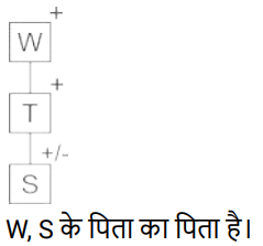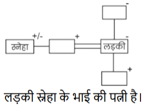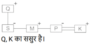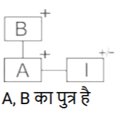 रक्त सम्बन्ध (भाग-IV)Total Questions: 5021. परिवार के चित्र को देखते हुए स्नेहा ने कहा, "वह मेरे भाई की पत्नी के पुत्र के पिता की सास की इकलौती पुत्री है। फोटो वाली लड़की स्नेहा से किस प्रकार संबंधित है ? [SSC CGL 27/07/2023 (1st shift)](a) पुत्रवधू(b) भाभी(c) माता(d) बहनCorrect Answer: (b) भाभीSolution:22. एक आदमी की ओर इशारा करते हुए रॉकी (एक पुरुष) ने कहा "वह मेरी बहू की बेटी का पिता है।" रॉकी उस आदमी से किस प्रकार संबंधित है ? [SSC CGL 27/07/2023 (2nd shift)](a) चाचा/ताऊ/मामा/मौसा(b) पुत्र(c) पिता(d) सालाCorrect Answer: (c) पिताSolution:23. 'Q + R' का अर्थ है कि 'Q, R का पिता है' 'Q − R' का अर्थ है कि 'Q, R की पत्नी है ' 'Q × R' का अर्थ है कि 'Q, R का भाई है' 'Q ÷ R' का अर्थ है कि 'Q, R की पुत्री है' यदि 'S ÷ Q + M × P - K', है, तो Q का K से क्या रिश्ता है ? [Graduate Level 27/06/2023 (Shift - 4)]यदि 'S ÷ Q + M × P - K', है, तो Q का K से क्या रिश्ता है?(a) ससुर(b) दामाद(c) पुत्र(d) पिताCorrect Answer: (a) ससुरSolution:24. तस्वीर में दिख रहे एक व्यक्ति की ओर इंगित करते हुए सनी नाम के एक लड़के ने कहा "वह मेरी बहन की माता के पति का भाई है"। तस्वीर वाले व्यक्ति के साथ सनी का क्या संबंध है ? [Graduate Level 28/06/2023 (Shift - 3)](a) दादा(b) भतीजा(c) भाई(d) पुत्रCorrect Answer: (b) भतीजाSolution:25. ‘Z + Q' का अर्थ है कि 'Z, Q का भाई है', 'Z × Q' का अर्थ है कि 'Z, Q का पिता है', 'Z ÷ Q' का अर्थहैकि 'Z, Q की माता है। निम्न में से किस विकल्प का अर्थ है कि 'A, B का पुत्र है' ? [Graduate Level 30/06/2023 (Shift - 1)](a) B × I × A(b) B + A × I(c) B ÷ A ÷ I(d) B × A + ICorrect Answer: (d) B × A + ISolution:26. एक आदमी की तस्वीर की ओर इंगित करते हुए मुस्कान नाम की एक महिला ने कहा "वह मेरे पिता के दादा का इकलौता पोता है" । तस्वीर वाले व्यक्ति के साथ मुस्कान का क्या संबंध है ? [Graduate Level 30/06/2023 (Shift - 1)](a) भाभी(b) बेटी(c) माँ(d) बहनCorrect Answer: (b) बेटीSolution:27. B + D' का अर्थ है 'B, D का ससुर है। 'B & D' का अर्थ है 'B, D का भाई है। 'B # D' का अर्थ है 'B, D की पत्नी है। 'B $ D' का अर्थ है 'B, D का पुत्र है'। 'B @ D' का अर्थ है 'B, D की माता है। [Higher Secondary 27/06/2023 (Shift - 3)]यदि O अपने माता - पिता की इकलौती संतान है, तो निम्नलिखित में से कौन-सा विकल्प दिए गए व्यंजक के संदर्भ में सही है ? M # L & N @ O $ P + R(a) R, O की पत्नी है।(b) L और P सहोदर हैं।(c) N का केवल एक पुत्र और एक पुत्री है।(d) N, R की माता है।Correct Answer: (a) R, O की पत्नी है।Solution:28. यदि, 'B % D' का अर्थ है 'B, D की बहन है', 'B & D' का अर्थ है 'B, D का पिता है', 'B × D' का अर्थ है 'B, D का पति है', 'B # D' का अर्थ है 'B, D का भाई है', 'B $ D' का अर्थ है 'B, D की पत्नी है', 'B @ D' का अर्थ है 'B, D की सास है' [Higher Secondary 28/06/2023 (Shift - 2)]तो दिए गए व्यंजक में A का K से क्या संबंध है? A × B @ C $ D # E & K(a) चाचा(b) भाई / बहन(c) दादा(d) भाईCorrect Answer: (c) दादाSolution:29. 'M + O' का अर्थ है कि 'M, O के पिता है' ‘M – O’ का अर्थ है कि 'M, O की माता है ' ‘M × O’ का अर्थ है कि 'M, O का भाई है' ‘M ÷ O’ अर्थ है कि 'M, O की बहन है' 'W + T + S' का क्या अर्थ है ? [Higher Secondary 28/06/2023 (Shift - 2)](a) W, S का पिता है(b) W, S की बहन है(c) W, S के पिता के पिता (दादा) है(d) W, S का भाई हैCorrect Answer: (c) W, S के पिता के पिता (दादा) हैSolution:30. ‘A + B' का अर्थ है 'A, B का पुत्र है। 'A - B' का अर्थ है 'A, B की माता है। 'A × B' का अर्थ है 'A, B