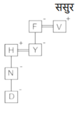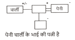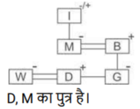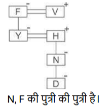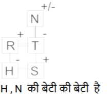 रक्त सम्बन्ध (भाग-IV)Total Questions: 5041. J, L का भाई है। H, J की पत्नी है। N, P की बहन है। L, N का पिता है। H, N से कैसे संबंधित है? [SSC CHSL 14/03/2023 (3rd Shift)](a) बहन(b) सास(c) पिता के भाई की पत्न(d) माँCorrect Answer: (c) पिता के भाई की पत्नSolution:42. यदि H, R की बेटी है। R, S का पिता है। S, T का बेटा है। T, N की बेटी है, तो H का N से क्या संबंध है? [SSC CHSL 15/03/2023 (1st Shift)](a) बेटी की बेटी(b) भांजी/भतीजी(c) बेटी(d) बहूCorrect Answer: (a) बेटी की बेटीSolution:43. सुमन ने एक लड़की की फोटो की ओर इशारा करते हुए कहा, "वह मेरे भाई के पिता की बेटी है। उस लड़की का सुमन से क्या संबंध है? (यह मानते हुए कि उस फोटो में सुमन नहीं है) [SSC CHSL 15/03/2023 (2nd Shift)](a) बेटी(b) भांजी(c) बहन(d) भाभीCorrect Answer: (c) बहनSolution:44. एक फोटो में एक महिला की ओर इशारा करते हुए, भीम ने कहा, "वह मेरी माँ के बेटे की एकमात्र बहन है। उस महिला का भीम से क्या संबंध है? [SSC CHSL 15/03/2023 (4th Shift)](a) दादी(b) भांजी(c) बेटी(d) बहनCorrect Answer: (d) बहनSolution:45. एक लड़के की तस्वीर की ओर इशारा करते हुए श्रेया ने कहा, "वह उस आदमी का इकलौता बेटा है जो मेरे पिता के इकलौते बेटे के बेटे का पिता है"। वह लड़का श्रेया से कैसे संबंधित है? [SSC CHSL 16/03/2023 (3rd Shift)](a) पिता(b) भतीजा(c) दामाद(d) भाईCorrect Answer: (b) भतीजाSolution:46. यदि पेनी चार्ली के भाई की बेटी की माँ है, तो पेनी का चार्ली से क्या संबंध है? [SSC CHSL 20/03/2023 (4th Shift)](a) बहन(b) भाभी(c) बहू(d) माँCorrect Answer: (b) भाभीSolution:47. A # B' का अर्थ है 'A, B का भाई है। 'A @ B' का अर्थ है 'A, B की पुत्री हैं। 'A & B' का अर्थ है 'A, B का पति है। 'A % B' का अर्थ है 'A, B की पत्नी है। यदि D @ N @ H & Y @ F % V है, तो N, F से किस प्रकार संबंधित है? [SSC CGL Tier II (02/03/2023)](a) पुत्रवधू(b) पुत्री(c) पुत्री की पुत्री(d) भांजीCorrect Answer: (c) पुत्री की पुत्रीSolution:48. A # B' का अर्थ है 'A, B का भाई है। 'A @ B' का अर्थ है 'A, B की पुत्री है'। 'A & B' का अर्थ है 'A, B का पति हैं। 'A % B' का अर्थ है 'A, B की पत्नी है'। यदि W % D # G @ B & M @ I है, तो D, M से किस प्रकार संबंधित है? [SSC CGL Tier II (02/03/2023)](a) दादाजी(b) पिता(c) पोता(d) पुत्रCorrect Answer: (d) पुत्रSolution:49. A # B' का अर्थ है 'A, B का भाई है' । 'A @ B' का अर्थ है 'A, B की पुत्री है' । 'A & B' का अर्थ है 'A, B का पति है' । 'A % B' का अर्थ है 'A, B की पत्नी है। यदि D @ N @ H & Y @ F % V है, तो V, H से किस प्रकार संबंधित है? [SSC CGL Tier II (03/03/2023)](a) दादाजी(b) पिता(c) दामाद(d) ससुरCorrect Answer: (d) ससुरSolution:50. 'A # B' का अर्थ है 'A, B का भाई है'। 'A @ B' का अर्थ है 'A, B की पुत्री है'। 'A & B' का अर्थ है 'A, B का पति है' । 'A % B' का अर्थ है 'A, B की पत्नी है। यदि D @ N @ H & Y @ F % V है, तो Y, D से किस प्रकार संबंधित है? [SSC CGL Tier II (06/03/2023)](a) माता(b) सास(c) बुआ(d) नानीCorrect Answer: (d) नानीSolution:Submit Quiz« Previous12345