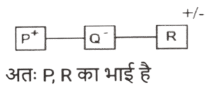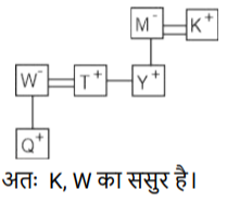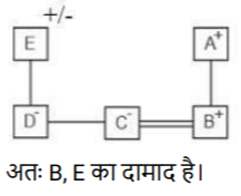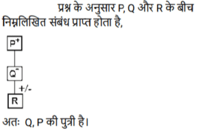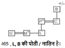 रक्त सम्बन्ध (भाग-V)Total Questions: 501. 'A # B' का अर्थ है 'A, B का भाई है'। 'A @ B' का अर्थ है 'A, B की पुत्री हैं। 'A & B' का अर्थ है 'A, B का पति है। 'A % B' का अर्थ है 'A, B की पत्नी है'। यदि Z % X # C @ V & B @ N है, तो Z , B से किस प्रकार संबंधित है? [SSC CGL Tier II (07/03/2023)](a) पुत्रवधू(b) पुत्री(c) सास(d) माताCorrect Answer: (a) पुत्रवधूSolution:2. 'A # B' का अर्थ है 'A, B का भाई है। 'A @ B' का अर्थ है 'A, B की पुत्री हैं। 'A & B' का अर्थ है 'A, B का पति है'। 'A % B' का अर्थ है 'A, B की पत्नी है'। यदि D @ N @ H & Y @ F % V है, तो Y, D से किस प्रकार संबंधित है? [SSC CGL Tier II (07/03/2023)](a) नानी(b) भांजी(c) माँ(d) पुत्री की पुत्रीCorrect Answer: (a) नानीSolution:3. A # B का अर्थ है कि 'A, B की बहन है' A @ B का अर्थ है कि 'A, B की पुत्री है' A & B का अर्थ है कि 'A, B का पति है ' A % B का अर्थ है कि 'A, B का पिता है' यदि A % B & C # D @ E है, तो B, E से किस प्रकार संबंधित है ? [SSC CGL 01/12/2022 (1st Shift)](a) भाई(b) दामाद(c) पिता(d) पुत्रCorrect Answer: (b) दामादSolution:4. A # B का अर्थ है 'A, B की बहन है'। A @ B का अर्थ है 'A, B का बेटा है। A & B का अर्थ है 'A, B के पिता है। A % B का अर्थ है 'A, B की माँ है। यदि W @ Q % T & Y @ M % K है, तो Q, K से किस प्रकार संबंधित है? [SSC CGL 02/12/2022 (1st Shift)](a) बेटी(b) दादी(c) माँ(d) नानीCorrect Answer: (b) दादीSolution:5. A + B का अर्थ है कि 'A, B के पिता हैं' A - B का अर्थ है कि 'A, B की माता हैं' A % B का अर्थ है कि 'A, B का भाई है' A & B का अर्थ है कि 'A, B का पुत्र है' यदि A + B & C - D + E है, तो A का E से क्या संबंध है? [SSC CGL 02/12/2022 (2nd Shift)](a) चाचा(b) पिता(c) भाई(d) दादाजीCorrect Answer: (d) दादाजीSolution:6. यदि A ÷ B का अर्थ है कि A, B का पिता है, A × B का अर्थ है कि A, B की माता है, A + B का अर्थ है कि A, B का भाई है, तो निम्नलिखित में से कौन सा व्यंजक यह निरूपित करता है, कि Q, P की पुत्री है? [SSC CGL 02/12/2022 (2nd Shift)](a) P ÷ Q × R(b) P ÷ Q + R(c) P × Q ÷ R(d) P + Q ÷ RCorrect Answer: (a) P ÷ Q × RSolution:7. यदि A + B का अर्थ है कि A, B का भाई है, A × B का अर्थ है कि A, B की बहन है, A ÷ B का अर्थ है कि A, B का पिता है, तो निम्नलिखित में से कौन सा व्यंजक यह निरूपित करता है, कि P, R का भाई है? [SSC CGL 02/12/2022 (3rd Shift)](a) P + Q ÷ R(b) P + Q × R(c) P × Q + R(d) Q + R × PCorrect Answer: (b) P + Q × RSolution:8. A # B का अर्थ है 'A, B की माँ है'। A @ B का अर्थ है 'A, B का बेटा है'। A & B का अर्थ है 'A, B का भाई है'। A % B का अर्थ है 'A, B की पत्नी है'। यदि W # Q @ T & Y @ M % K है, तो K, W से किस प्रकार संबंधित है? [SSC CGL 03/12/2022 (1st Shift)](a) पिता(b) ससुर(c) देवर(d) भाईCorrect Answer: (b) ससुरSolution:9. A # B का अर्थ है कि 'A, B का भाई है' A @ B का अर्थ है कि 'A, B की पुत्री है' A & B का अर्थ है कि 'A, B का पति है' A % B का अर्थ है कि 'A, B की पत्नी है' यदि G % M # L @ P & C @ B है, तो L, B से किस प्रकार संबंधित है ? [SSC CGL 03/12/2022 (2nd Shift)](a) बेटी(b) पोती / नातिन(c) बहन(d) बहूCorrect Answer: (b) पोती / नातिनSolution:10. A + B का अर्थ है कि 'A, B के पिता हैं' A – B का अर्थ है कि 'A, B की माता है' A @ B का अर्थ है कि 'A, B का पुत्र है A # B का अर्थ है कि 'A, B की पुत्री है' यदि A # B – C @ D + E है, तो A का E से क्या संबंध है? [SSC CGL 03/12/2022 (4th Shift)](a) भाभी(b) माता(c) बहन(d) पुत्रीCorrect Answer: (c) बहनSolution:Submit Quiz12345Next »