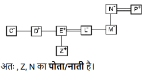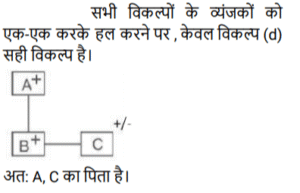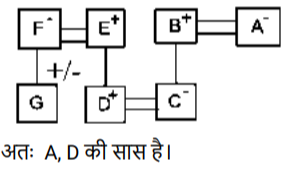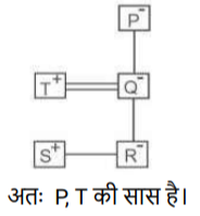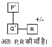 रक्त सम्बन्ध (भाग-V)Total Questions: 5011. यदि A ÷ B का अर्थ है कि A, B की माता है, A - B का अर्थ है कि A, B का पिता है, A + B का अर्थ है कि A, B की बहन है, तो निम्नलिखित में से कौन सा व्यंजक यह निरूपित करता है, कि P, R की माता है? [SSC CGL 05/12/2022 (2nd Shift)](a) P + Q – R(b) P ÷ Q + R(c) P – R + Q(d) Q + P – RCorrect Answer: (b) P ÷ Q + RSolution:12. यदि X × Y का अर्थ है कि X, Y का पिता है, X ÷ B का अर्थ है कि X, B की माता है, X - Y का अर्थ है कि X, Y का भाई है, तो निम्नलिखित में से कौन सा व्यंजक यह निरूपित करता है, कि A, C का पिता है? [SSC CGL 06/12/2022 (2nd Shift)](a) A – B × C(b) A ÷ B – C(c) A × B ÷ C(d) A × B – CCorrect Answer: (d) A × B – CSolution:13. A @ B' का अर्थ है 'A, B का पति है'। 'A & B' का अर्थ है 'A, B की माता है। 'A # B' का अर्थ है 'B, A की पुत्री है। यदि D # E # F & G @ H # I है, तो G, E से किस प्रकार संबंधित है? [SSC CGL 06/12/2022 (3rd Shift)](a) पुत्री(b) पुत्र(c) पिता(d) नातीCorrect Answer: (d) नातीSolution:14. यदि A + B का अर्थ है कि A, B का पिता है, A - B का अर्थ है कि A, B की माता है, A × B का अर्थ है कि A, B का भाई है, तो निम्नलिखित में से कौन सा व्यंजक यह निरूपित करता है, कि Q, P का पुत्र है? [SSC CGL 06/12/2022 (3rd Shift)](a) P – R × Q(b) Q – P × R(c) R – Q + P(d) P – Q × RCorrect Answer: (d) P – Q × RSolution:15. A - B का अर्थ है कि 'A, B की माता है' A * B का अर्थ है कि 'A, B की बहन है’ A % B का अर्थ है कि 'A, B का पति है' A $ B का अर्थ है कि 'A, B का पुत्र है ' यदि P - Q - R * S $ T है, तो P का T से क्या संबंध है? [SSC CGL 06/12/2022 (4th Shift)](a) माता(b) सास(c) बहन(d) भाभीCorrect Answer: (b) सासSolution:16. A $ B का अर्थ है 'A, B का पति है A @ B का अर्थ है 'A, B की पुत्री है A # B का अर्थ है 'A, B का पिता है' A * B का अर्थ है 'A, B की माँ है यदि X @ Y $ J * M, है, तो X, M से किस प्रकार संबंधित है? [SSC CGL 07/12/2022 (1st Shift)](a) भाई(b) भाभी(c) बहन(d) दादीCorrect Answer: (c) बहनSolution:17. A + B का अर्थ है कि 'A, B के पिता है' A - B का अर्थ है कि 'A, B की माता है' A* B का अर्थ है कि 'A, B की बहन है' A % B का अर्थ है कि 'A, B का पति है यदि A % B - C + D * E है, तो A का E से क्या संबंध है? [SSC CGL 07/12/2022 (4th Shift)](a) दादा जी(b) भाई(c) चाचा(d) ससुरCorrect Answer: (a) दादा जीSolution:18. A & B का अर्थ है कि 'A, B की पत्नी है A # B का अर्थ है कि 'A, B का पिता है' A @ B का अर्थ है कि 'A, B का पुत्र है A % B का अर्थ है कि 'A, B का पति है' A + B का अर्थ है कि 'A, B की मां है' यदि A & B # C & D @ E % F + G है, तो A, D से किस प्रकार संबंधित है? [SSC CGL 08/12/2022 (1st Shift)](a) बहू(b) सास(c) मां(d) बहनCorrect Answer: (b) सासSolution:19. A & B का अर्थ है कि 'A, B का पुत्र है' A # B का अर्थ है कि 'A, B की बहन है' A @ B का अर्थ है कि 'A, B का भाई है' A % B का अर्थ है कि 'A, B का पिता है' A - B का अर्थ है कि 'A, B की पुत्री है' A * B का अर्थ है कि 'A, B की पत्नी है' यदि C # D @ E % Z & L # M – N * P है, तो Z, N से किस प्रकार संबंधित है? [SSC CGL 08/12/2022 (2nd Shift)](a) पुत्र(b) दादा(c) पिता(d) पोता/नातीCorrect Answer: (d) पोता/नातीSolution:20. यदि L + M का अर्थ है कि L, M का पिता है, L × M का अर्थ है कि L, M की माता है, L - M का अर्थ है कि L, M का भाई है, तो निम्नलिखित में से कौन सा व्यंजक यह निरूपित करता है, कि A, B का चाचा/फूफ़ा है? [SSC CGL 09/12/2022 (1st Shift)](a) A - C + B(b) A - B + C(c) A + B - C(d) A - B × CCorrect Answer: (a) A - C + BSolution:Submit Quiz« Previous12345Next »