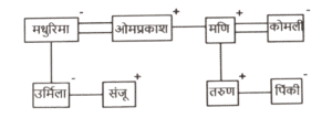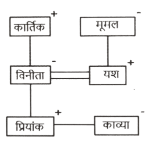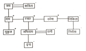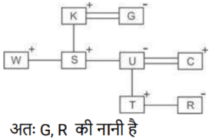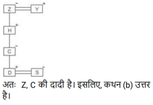रक्त सम्बन्ध (भाग-VI)Total Questions: 251. एक परिवार में छह सदस्य, P, Q, R, S, T और U हैं। T, P के पति का भाई है। U, T की माता है। Q, S और P की पुत्री है और R की पोती है। R, T से संबंधित कैसे है ? [SSC CGL 12/04/2022 (Evening)](a) पिता(b) बेटा(c) भाई(d) चाचाCorrect Answer: (a) पिताSolution:2. यदि अर्पिता, प्रीतम की पत्नी की माँ के पति की इकलौती पुत्री है, तो अर्पिता का प्रीतम के पुत्र से क्या सम्बन्ध है ? [SSC CGL 13/04/2022 (Evening)](a) बहन(b) पैतृक पोती(c) बेटी(d) माँCorrect Answer: (d) माँSolution:3. 'A + B' का अर्थ है 'A B की बेटी है'। 'A $ B' का अर्थ है 'A B का पति है'। 'A @ B' का अर्थ है 'A B का भाई है'। 'A & B' का अर्थ है 'A B की माँ है'। 'A % B' का अर्थ है 'A B का बेटा है'। यदि ‘W @ S % K $ G & U & T @ R + C’, है, तो निम्नलिखित में से कौन सा कथन सही है ? [SSC CGL 18/04/2022 (Morning)](a) G, R की नानी है।(b) G, W का पिता है।(c) C, K का ससुर है।(d) C, U की पत्नी है।Correct Answer: (a) G, R की नानी है।Solution:4. ‘A # B’ का अर्थ है 'A, B की बहन है'; ‘A $ B’ का अर्थ है 'A, B का पिता है'। ‘A @ B’ का अर्थ है 'A, B की पत्नी है'। ‘A % B’ का अर्थ है 'A, B का भाई है'। निम्नलिखित में से किस विकल्प का अर्थ है 'J, R का पिता है'? [SSC CGL 21/4/2022 (Morning)](a) C @ J % K $ M # R(b) C @ R $ K % M # J(c) C @ J $ K % M # R(d) J @ C $ K % M # RCorrect Answer: (c) C @ J $ K % M # RSolution:5. 'R 8 S' का अर्थ है 'R, S का पिता है'। 'R 7 S' का अर्थ है 'R, S की बहन है'। 'R 6 S' का अर्थ है 'R, S का भाई है'। 'R 2 S' का अर्थ है 'R, S की पत्नी है'। निम्नलिखित में से कौन-सा व्यंजक 'X, Y की माता है' को प्रदर्शित करता है ? [SSC CGL 13/08/2021 (Afternoon)](a) X 7 M 6 O 2 Y(b) X 8 M 2 Y(c) X 2 M 8 O 2 Y(d) X 2 M 8 YCorrect Answer: (d) X 2 M 8 YSolution:विकल्प (d) के अनुसार, आरेख सेयह स्पष्ट हैकि X, Y की माता है।6. यश कार्तिक की इकलौती बेटी का पति है। मूमल विनीता की सास है। प्रियांक काव्या के भाई हैं। काव्या, विनीता की पुत्री है। कार्तिक काव्या के नाना हैं। यश मूमल से किस प्रकार संबंधित है ? [SSC CGL 13/08/2021 (Evening)](a) बेटा(b) दामाद(c) पिता(d) मातृक पौत्रCorrect Answer: (a) बेटाSolution:आरेख सेस्पष्ट हैकि विनीता की सास यानि मूमल यश की माता हैं। इसलिए, यश मूमल का पुत्र है।7. 'A + B' का अर्थ है 'A, B का पति है'। 'A % B' का अर्थ है 'A, B का पिता है' 'A $ B' का अर्थ है 'A, B की मां है'। यदि ‘Y + Z $ H % C $ D + S’, तो निम्नलिखित में से कौन सा कथन गलत है ? [SSC CGL 13/08/2021 (Evening)](a) H, D का नाना है।(b) Z, C की नानी है।(c) H, Y का पुत्र है।(d) C, S की सास है।Correct Answer: (b) Z, C की नानी है।Solution:8. राम, रजत और रमेश कविता के तीन पुत्र हैं। मुकुल राम का पुत्र है। मुकुल के दादा जय हैं। जय की एक बेटी निकिता है। रजत के बेटे, अभिराम की शादी रानी से हुई हैऔर उनकी बेटी इना है। निर्मला निकिता की पुत्री है। जय इना से कैसे संबंधित है ? [SSC CGL 17/08/2021 (Evening)](a) परदादा(b) दादाजी(c) पैतृक चाचा(d) ससुरCorrect Answer: (a) परदादाSolution:अतः जय इना के परदादा है।9. एक परिवार में दो जोड़े हैं। कोमली के दो बच्चे हैं। मधुरिमा ओम प्रकाश की पत्नी हैं, जो मणि के भाई हैं। पिंकी कोमली की बेटी है। उर्मिला संजू की बहन है, जो ओम प्रकाश का पुत्र है। तरुण मणि का पुत्र है, जो एक पुरुष है। मधुरिमा, कोमली से किस प्रकार संबंधित है ? [SSC CGL 20/08/2021 (Morning)](a) बह