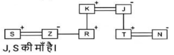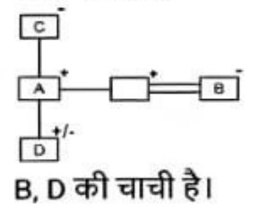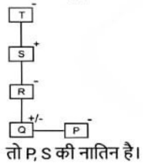 रक्त सम्बन्ध (भाग-VI)Total Questions: 2521. A # B का अर्थ है, A, B का पति है। A @ B का अर्थ है, A, B की बहन है। A & B का अर्थ है, A, B की माँ है। A % B का अर्थ है, A, B का बेटा है। यदि S # Z @ R % K # J & T # N है तो निम्न में से कौन सा कथन गलत है ? [SSC CPO 24/11/2020 (Morning)](a) R और T भाई हैं।(b) Z, T की बहन है।(c) K, N का ससुर है।(d) J, S की माँ है।Correct Answer: (d) J, S की माँ है।Solution:22. एक आदमी की ओर इशारा करते हुए एक महिला ने कहा, "उसका भाई मेरी माँ की एकमात्र बेटी के पति के बेटे का पिता हैं" महिला के पति से आदमी का क्या सम्बन्ध है ? [SSC CPO 24/11/2020 (Evening)](a) जीजा / साला(b) भाई(c) पिता(d) चाचाCorrect Answer: (b) भाईSolution:अतः आदमी , महिला के पति का भाई है।23. पांच सदस्यों वाले परिवार में P, Q की बहन है और R, Q की मां है। S, R का पिता है और T, S की माँ है। P, S से कैसे संबंधित है ? [SSC CPO 25/11/2020 (Morning)](a) नातिन(b) भतीजी(c) माँ(d) बेटीCorrect Answer: (a) नातिनSolution:24. C, B की सास है; A, C का बड़ा पुत्र है और D का पिता है। यदि B, A की पत्नी नहीं है, तो B, D से किस प्रकार संबंधित है ? [SSC CPO 25/11/2020 (Evening)](a) बहन(b) माँ(c) मामी(d) आंटीCorrect Answer: (d) आंटीSolution:25. एक महिला के चित्र की ओर इशारा करते हुए कनिका ने कहा, "उनकी बहू मेरे बेटे के दादा के इकलौते बेटे की पत्नी है।" चित्र में महिला कनिका से कैसे संबंधित है ? [SSC CPO 25/11/2020 (Evening)](a) भाभी(b) सास(c) पैतृक चाची(d) मांCorrect Answer: (b) सासSolution:महिला कनिका की सास हैं।Submit Quiz« Previous123