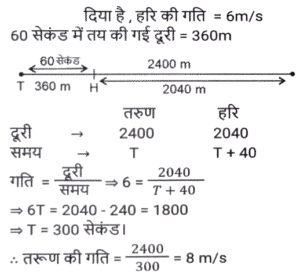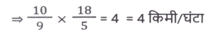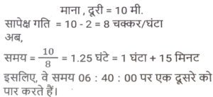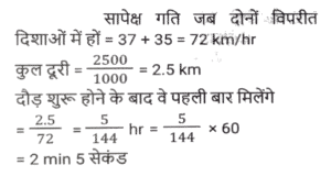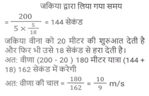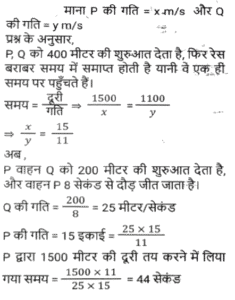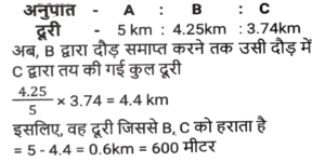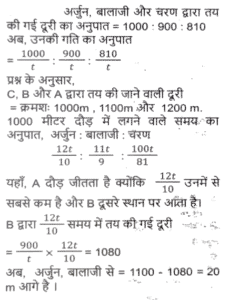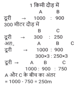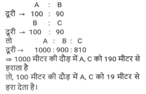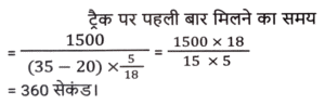 रेखीय और वृत्ताकार दौड़Total Questions: 6711. 1000 मीटर की दौड़ में अर्जुन, बालाजी और चरण दौड़ रहे हैं। अर्जुन ने बालाजी को 100 मीटर और बालाजी ने चरण को 100 मीटर से हराया। अगली 1000 मीटर की दौड़ में (गति पहले की तरह ही है), बालाजी, चरण से 100 मीटर पीछे से दौड़ता है, और अर्जुन बालाजी से 100 मीटर पीछे से दौड़ता है वह दूरी ज्ञात कीजिए जिससे विजेता अपने ठीक पीछे वाले व्यक्ति से आगे है। [SSC CGL 13/12/2022 (1st Shift)](a) 10 m(b) 40 m(c) 30 m(d) 20 mCorrect Answer: (d) 20 mSolution:12. 1500 m की रेस में, यदि वाहन P वाहन Q को 200 m की बढ़त देता है, तो वाहन P, 8 सेकंड से रेस जीत जाता है। इसके विपरीत, यदि वाहन P वाहन Q को 400 m की बढ़त देता है, तो रेस बराबरी पर समाप्त होती है। वाहन P को 1500 m चलने में कितना समय (सेकंड में) लगता है ? [SSC CGL 07/12/2022 (1st Shift)](a) 44(b) 45(c) 40(d) 60Correct Answer: (a) 44Solution:13. 2500 मीटर की एक वृत्ताकार दौड़ में, एक पुरुष और एक महिला क्रमशः 37 km/h और 35 km/h की गति से विपरीत दिशाओं की ओर एक बिंदु से दौड़ना शुरू करते हैं। दौड़ शुरू होने के कितने समय बाद वे पहली बार मिलेंगे? [SSC CHSL 02/06/2022 (Morning)](a) 2 मिनट 40 सेकंड(b) 2 मिनट 30 सेकंड(c) 2 मिनट 5 सेकंड(d) 2 मिनट 20 सेकंडCorrect Answer: (c) 2 मिनट 5 सेकंडSolution:14. 200 मीटर की पैदल दौड़ में, जकिया 5 किमी/घंटा की औसत गति से चलती है। वह वीना को 20 मीटर की शुरुआत देती है और फिर भी उसे 18 सेकंड से हरा देती है। वीणा की औसत गति (किमी/घंटा में) क्या है ? [SSC MTS 20/10/2021 (Morning)](a) 4.2(b) 4.5(c) 4(d) 3.5Correct Answer: (c) 4Solution:15. 100 मीटर की दौड़ में A, B को 10 मीटर से हराता है और B, C को 10 मीटर से हराता है। A, C को कितनी दूरी से हराता है (मीटर में)? [SSC MTS 9/08/2019 (Afternoon)](a) 19(b) 18(c) 20(d) 21Correct Answer: (a) 19Solution:16. 2400 m की दौड़ में तरुण, हरि को 60 सेकंड की शुरुआती बढ़त देता है और फिर भी उसे 40 सेकंड से हरा देता है। यदि हरि की चाल 6 m/s है, तो तरुण की चाल ज्ञात कीजिए। [SSC CHSL Tier II (18/11/2024)](a) 8 m/s(b) 7 m/s(c) 8.5 m/s(d) 7.5 m/sCorrect Answer: (a) 8 m/sSolution:17. 1500 m की एक वृत्ताकार दौड़ में, P और Q एक ही बिंदु से और एक ही समय पर क्रमशः 20 km/h और 35 km/h की चाल से दौड़ना शुरू करते हैं। यदि वे एक ही दिशा में दौड़ रहे हैं तो वे ट्रैक पर पहली बार कितने समय बाद मिलेंगे। [SSC MTS 30/09/2024 (Evening)](a) 340 सेकंड(b) 640 सेकंड(c) 840 सेकंड(d) 360 सेकंडCorrect Answer: (d) 360 सेकंडSolution:18. 5 km की एक दौड़ में, A, B को 750 मीटर और C को 1260 मीटर से हराता है। उसी दौड़ में B, C को कितने मीटर से हराता है ? [SSC MTS 08/10/2024 (Afternoon)](a) 700 मीटर(b) 600 मीटर(c) 500 मीटर(d) 400 मीटरCorrect Answer: (b) 600 मीटरSolution:19. स्कूल के खेल दिवस के दौरान कक्षा VII के तीन विद्यार्थियों ने 1 km की दौड़ में भाग लिया। यदि A, B से 100 m के अंतर से दौड़ जीत जाता है और B, C को 300 m की दौड़ में 50m से हरा देता है, तो 1 km की दौड़ में, A, C को कितने अंतर से हराएगा ? [SSC MTS 15/10/2024 (Afternoon)](a) 700 m(b) 750 m(c) 150 m(d) 250 mCorrect Answer: (d) 250 mSolution:20. अजीत एक वृत्ताकार मैदान के चारों ओर दो चक्कर प्रति घंटे की चाल से पैदल चलता है, जबकि मोहित इसके चारों ओर 10 चक्कर प्रति घंटे की चाल से दौड़ता है। वे 6.30 a.m. पर एक ही बिंदु से एक ही दिशा में प्रस्थान करते हैं। वह समय ज्ञात 