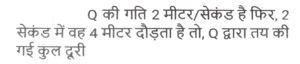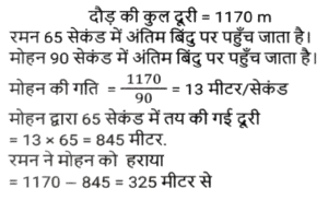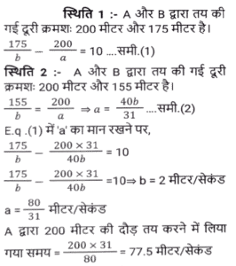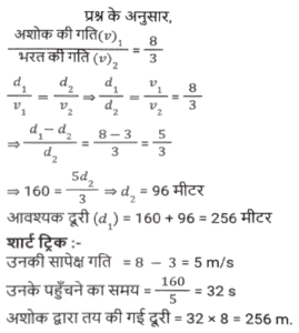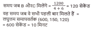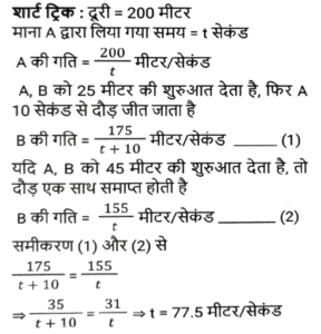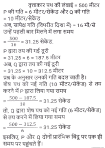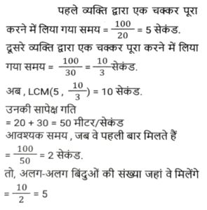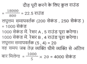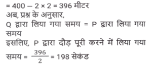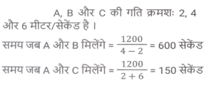 रेखीय और वृत्ताकार दौड़Total Questions: 6741. 140 m की एक दौड़ में, पंकज 5/2 m/s की चाल से दौड़ता है। वह अरुण को 20 m की बढ़त देता है और फिर भी उसे 4 सेकंड से हरा देता है। अरुण की चाल क्या है? [SSC CHSL 10/08/2023 (4th Shift)](a) 1.75 m/s(b) 1.25 m/s(c) 2 m/s(d) 1.5 m/sCorrect Answer: (c) 2 m/sSolution:42. A, B और C एक साथ, एक समान बिंदु से दौड़ना शुरू करते हैं। वे 1200 m लंबाई के एक वृत्ताकार ट्रैक के परितः क्रमशः 2 मीटर/सेकंड, 4 मीटर/सेकंड और 6 m/s की चाल से दौड़ते हैं। A और B एक ही दिशा में दौड़ते हैं, जबकि C अन्य दो के विपरीत दिशा में दौड़ता है। वे पहली बार कितने समय के बाद मिलेंगे? [SSC CGL 17/07/2023 (2nd shift)](a) 10 मिनट(b) 9 मिनट(c) 12 मिनट(d) 11 मिनटCorrect Answer: (a) 10 मिनटSolution:43. धावक A और धावक B, 800m लंबाई के एक वृत्तीय पथ पर 18 km की दौड़ दौड़ते हैं। दोनों क्रमशः 200 सेकंड और 250 सेकंड में एक चक्कर पूरा करते हैं। दौड़ आरंभ होने के कितने समय बाद तेज व्यक्ति, धीमे व्यक्ति से आखिरी बार मिलेगा ? [SSC CGL 17/07/2023 (4th shift)](a) 2700 सेकंड(b) 4000 सेकंड(c) 2250 सेकंड(d) 1800 सेकंडCorrect Answer: (b) 4000 सेकंडSolution:44. 1170 m की दौड़ में, रमन 65 सेकंड में अंतिम बिंदु पर पहुंचता है और मोहन 90 सेकंड में अंतिम बिंदु पर पहुंचता है। रमन, मोहन को कितनी दूरी से हराता है? [SSC CGL 19/07/2023 (1st shift)](a) 325m(b) 300m(c) 375m(d) 350mCorrect Answer: (a) 325mSolution:45. दो व्यक्ति एक साथ एक वृत्ताकार ट्रैक पर विपरीत दिशाओं में 20 m/s और 30 m/s की चाल से दौड़ना शुरू करते हैं। यदि वृत्ताकार पथ की परिधि 100m है, तो ज्ञात कीजिए कि वे एक-दूसरे को कितने अलग-अलग बिंदुओं पर पार करेंगे? [SSC CGL 19/07/2023 (2nd shift)](a) 3(b) 2(c) 10(d) 5Correct Answer: (d) 5Solution:46. अशोक, भरत से 2⅔ गुना तेज दौड़ता है। यदि अशोक, भरत को 160m की प्रारंभिक बढ़त देता है, तो लक्ष्य स्तंभ कितना दूर होना चाहिए, ताकि अशोक और भरत एक ही समय में उस तक पहुंच सकें? [SSC CGL 19/07/2023 (4th shift)](a) 225m(b) 256m(c) 240m(d) 200mCorrect Answer: (b) 256mSolution:47. P, Q को 400 मीटर की दौड़ में 2 सेकंड की शुरुआत (head - start) देता है, लेकिन दोनों एक ही समय में दौड़ पूरी करते हैं। यदि Q की चाल 2 मीटर/सेकंड है तो P द्वारा दौड़ पूरी करने में लिया गया समय ज्ञात कीजिए। [SSC CGL 20/07/2023 (3rd shift)](a) 198 सेकंड(b) 199 सेकंड(c) 200 सेकंड(d) 195 सेकंडCorrect Answer: (a) 198 सेकंडSolution:48. 200 m की रैखिक दौड़ में, यदि A, B को 25m का स्टार्ट (शुरुआती लाभ) देता है, तो A दौड़ को 10 सेकंड से जीत जाता है। वैकल्पिक रूप से, यदि A, B को 45m का स्टार्ट (शुरुआती लाभ) देता है, तो दौड़ डेड हीट (बराबरी) में समाप्त हो जाती है। A को 200 m दौड़ने में कितना समय लगता है? [SSC CGL 24/07/2023 (3rd shift)](a) 78 सेकंड(b) 77 सेकंड(c) 78.5 सेकंड(d) 77.5 सेकंडCorrect Answer: (d) 77.5 सेकंडSolution:49. एक ही बिंदु से और एक ही समय पर दौड़ना शुरू करके, दो धावक P और Q क्रमशः 6m/s और 10 m/s की चाल से 500m लंबे एक वृत्ताकार ट्रैक के परितः विपरीत दिशाओं में दौड़ रहे हैं। यदि वे पहली बार मिलने के बाद अपनी चाल परस्पर बदल लेते हैं, तो शुरुआती बिंदु पर सबसे पहले कौन पहुंचेगा? [SSC CGL 25/07/2023 (4th shift)](a) Q(b) P(c) P और Q दोनों समान समय पर पहुंचेंगे।(d) P और Q में से कोई नहींCorrect Answer: (c) P और Q दोनों समान स
