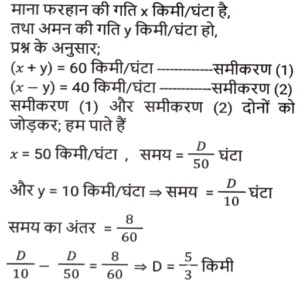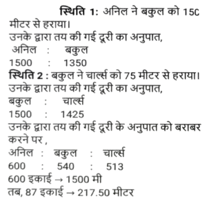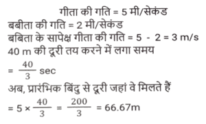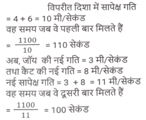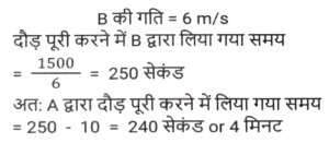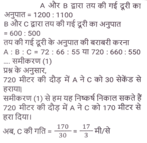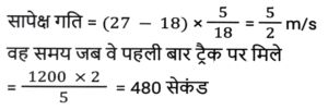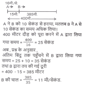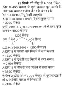 रेखीय और वृत्ताकार दौड़Total Questions: 6751. वृत्ताकार ट्रैक पर हो रही 1200 m की एक दौड़ में A और B एक ही स्थान से एक ही समय पर, एक ही दिशा में क्रमशः 18 km/h और 27 km/h की चाल से दौड़ना शुरू करते हैं। दौड़ शुरू होने के कितने समय बाद वे ट्रैक पर पहली बार मिलेंगे? [SSC CHSL Tier II (26/06/2023)](a) 300 सेकंड(b) 480 सेकंड(c) 520 सेकंड(d) 240 सेकंडCorrect Answer: (b) 480 सेकंडSolution:52. फरहान और अमन दिल्ली से हरियाणा जा रहे हैं। उन दोनों की चाल में अंतर और उनकी चाल का योग क्रमशः 40 km/hour और 60 km/hour है। अगर इस रेस को फरहान अमन से 8 मिनट पहले पूरी कर सकता है, तो वह दूरी ज्ञात कीजिए जो दोनों को पूरी करनी चाहिए। [SSC CHSL 21/03/2023 (1st Shift)](a) 5/3 km(b) 8/3 km(c) 3/5 km(d) 3/8 kmCorrect Answer: (a) 5/3 kmSolution:53. 1500m की दौड़ में, अनिल ने बकुल को 150m से हराया और उसी दौड़ में बकुल ने चार्ल्स को 75 m से हराया। अनिल चार्ल्स को कितनी दूरी से हराता है? [SSC CGL 01/12/2022 (1st Shift)](a) 217.50 m(b) 200.15 m(c) 293.50 m(d) 313.75 mCorrect Answer: (a) 217.50 mSolution:54. 400 मीटर की दौड़ में, A 16 मीटर/सेकंड की चाल से दौड़ता है। यदि A, B को 15 मीटर की शुरुआत देता है और फिर भी उसे 10 सेकंड से हरा देता है, तो B की चाल क्या है? [SSC CGL 02/12/2022 (2nd Shift)](a) 11 मी/सेकंड(b) 10 मी/सेकंड(c) 13 मी/सेकंड(d) 9 मी/सेकंडCorrect Answer: (a) 11 मी/सेकंडSolution:55. 1200m की दौड़ में बाइक A, बाइक B को 100 m से हराती है। 600m की दौड़ में बाइक B, बाइक C को 100m से हराती है। यदि बाइक A 720m की दौड़ में बाइक C को 30 सेकंड से हरा देती है, तो बाइक C की चाल की गणना करें। [SSC CGL 03/12/2022 (4th Shift)](a) 17/3 मीटर/सेकंड(b) 26/9 मीटर/सेकंड(c) 17/9 मीटर/सेकंड(d) 26/9 मीटर/सेकंडCorrect Answer: (a) 17/3 मीटर/सेकंडSolution:56. गीता बबीता से 5/2 गुना तेज दौड़ती है। एक रेस में, यदि गीता, बबीता को 40m की बढ़त देती है, तो प्रारंभिक बिंदु से उस बिंदु तक की दूरी ज्ञात कीजिए जहां वे दोनों मिलेंगी (दशमलव के बाद दो स्थानों तक पूर्णांकित । [SSC CPO 10/11/2022 (Morning)](a) 66.67m(b) 65m(c) 65.33m(d) 66mCorrect Answer: (a) 66.67mSolution:57. A और B 1200m लंबे वृत्ताकार ट्रैक पर 12 km की दौड़ लगाते हैं। वे क्रमशः 300 सेकंड और 400 सेकंड में एक चक्कर पूरा करते हैं। प्रारंभ से कितने समय बाद तेज व्यक्ति, धीमे व्यक्ति से अंतिम बार मिलेगा ? [SSC CPO 10/11/2022 (Evening)](a) 2400 सेकंड(b) 8400 सेकंड(c) 9600 सेकंड(d) 10800 सेकंडCorrect Answer: (a) 2400 सेकंडSolution:58. A, 1500 मीटर की दौड़ में B को 10 सेकंड की शुरुआत (हेड-स्टार्ट) देता है और दोनों एक ही समय में दौड़ पूरी करते हैं। यदि B की चाल 6 m/s है, तो A को दौड़ पूरी करने में (मिनट में) कितना समय लगा? [SSC CPO 11/11/2022 (Afternoon)](a) 3(b) 4(c) 8(d) 5Correct Answer: (b) 4Solution:59. जॉय और कैट 1100 m लंबाई के एक वृत्ताकार ट्रैक के परितः क्रमश: 6m/sec और 4 m/sec की प्रारंभिक चाल से विपरीत दिशाओं में दौड़ते हैं। जब भी वे मिलते हैं उसी बिंदु से शुरू करते हुए, जॉय की चाल आधी हो जाती है और कैट की चाल दोगुनी हो जाती है। वे शुरूआत से कितने समय के बाद दूसरी बार मिलेंगे ? [Graduate Level 05/08/2022 (Shift - 3)](a) 190 सेकंड(b) 210 सेकंड(c) 220 सेकंड(d) 200 सेकंडCorrect Answer: (b) 210 सेकंडSolution:60. राहुल 100 मीटर की दौड़ में 6 km/h की चाल से दौड़ता है। राहुल, भरत को 4 मीटर की बढ़त देता ह