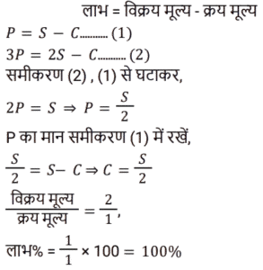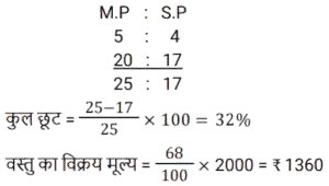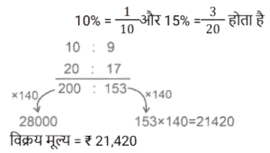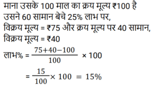 लाभ और हानि Part-2Total Questions: 501. एक व्यापारी ने अपने माल का तीन-पाँचवाँ भाग 25% के लाभ पर और शेष लागत मूल्य पर बेचा। पूरे सौदे में उसका हानि या लाभ प्रतिशत क्या है? [(Group D 24/08/2022 ( Evening ))](a) 15% लाभ(b) 18% हानि(c) 18% लाभ(d) 15% हानिCorrect Answer: (a) 15% लाभSolution:2. एक व्यापारी अपने माल पर क्रय मूल्य से 26% अधिक मूल्य अंकित करता है और फिर उस पर 13% की छूट प्रदान करता है। उसका लाभ (% में) ज्ञात कीजिए। [(Group D 25/08/2022 ( Morning ))](a) 6.29(b) 9.62(c) 9.26(d) 6.92Correct Answer: (b) 9.62Solution:3. एक दुकानदार ₹2,000 अंकित मूल्य वाली वस्तु पर 20% और 15% की क्रमिक छूट देता है। वह वस्तु को किस मूल्य पर बेचता है? [(Group D 25/08/2022 ( Morning ))](a) ₹1,300(b) ₹1,240(c) ₹1,360(d) ₹1,200Correct Answer: (c) ₹1,360Solution:4. यदि एक अलमारी का विक्रय मूल्य दोगुना कर दिया जाए, तो उस पर होने वाला लाभ तीन गुना हो जाता है। लाभ प्रतिशत ज्ञात कीजिए। [(Group D 25/08/2022 ( Afternoon ))](a) 25%(b) 10%(c) 50%(d) 100%Correct Answer: (d) 100%Solution:5. यदि एक व्यक्ति ₹5 में 6 पेंसिल खरीदता है और उन्हें ₹6 में 5 पेंसिल की दर पर बेचता है, तो प्रतिशत लाभ ____ है। [(Group D 25/08/2022 ( Afternoon ))](a) 43%(b) 41%(c) 42%(d) 44%Correct Answer: (d) 44%Solution:6. किसी स्टोर में, लाभ क्रय मूल्य के 260% के बराबर है। यदि विक्रय मूल्य ₹7,200 है, तो क्रय मूल्य ज्ञात कीजिए। [(Group D 25/08/2022 ( Evening ))](a) ₹2,420(b) ₹2,000(c) ₹3,000(d) ₹2,200Correct Answer: (b) ₹2,000Solution:7. एक दुकानदार ने ₹28,000 के अंकित मूल्य वाली वस्तु पर 10% और 15% की क्रमिक छूट दी। वस्तु का विक्रय मूल्य ज्ञात कीजिए। [(Group D 25/08/2022 ( Evening ))](a) ₹21,420(b) ₹21,402(c) ₹22,140(d) ₹21,240Correct Answer: (a) ₹21,420Solution:8. दो कुर्सियों और तीन मेजों का मूल्य ₹1,450 है। यदि एक कुर्सी का मूल्य एक मेज से ₹250 कम है, तो एक मेज का मूल्य ज्ञात कीजिए। [(Group D 26/08/2022 ( Morning ))](a) ₹390(b) ₹440(c) ₹320(d) ₹350Correct Answer: (a) ₹390Solution:9. ₹275 के अंकित मूल्य वाली किसी वस्तु को 5% छूट पर बेचा जाता है। विक्रेता को फिर भी 4.5% का लाभ प्राप्त होता है। उसने इसके लिए कितना भुगतान किया था? [(Group D 26/08/2022 ( Afternoon ))](a) ₹250(b) ₹225(c) ₹125(d) ₹200Correct Answer: (a) ₹250Solution:10. एक दुकानदार को अपने माल का अंकित मूल्य, क्रय मूल्य से कितने प्रतिशत अधिक रखना चाहिए, ताकि अंकित मूल्य पर 8% की छूट देने के बाद भी उसे 15% का लाभ हो? [(Group D 26/08/2022 ( Afternoon ))](a) 25%(b) 40%(c) 30%(d) 27%Correct Answer: (a) 25%Solution:Submit Quiz12345Next »