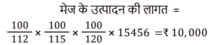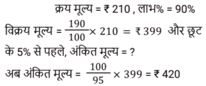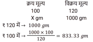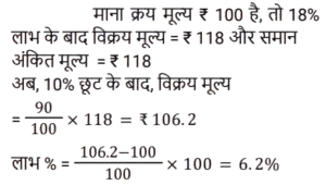 लाभ और हानि Part-2Total Questions: 5011. किसी वस्तु को उसके अंकित मूल्य पर बेचने पर एक खुदरा विक्रेता को 18% का लाभ प्राप्त होता है। यदि वह अंकित मूल्य पर 10% की छूट देता है, तो उस वस्तु पर उसका वास्तविक लाभ कितना होगा? [(Group D 26/08/2022 ( Evening ))](a) 5.5%(b) 7.1%(c) 4.6%(d) 6.2%Correct Answer: (d) 6.2%Solution:12. एक बेईमान डीलर अपने माल को क्रय मूल्य पर बेचने का दावा करता है, लेकिन गलत बाट का उपयोग करता है और इस प्रकार 20% लाभ प्राप्त करता है। एक किलोग्राम के लिए वह कितने ग्राम वाले बाट का उपयोग करता है? [(Group D 26/08/2022 ( Evening ))](a) 750.5 gm(b) 708.06 gm(c) 833.33 gm(d) 785.5 gmCorrect Answer: (c) 833.33 gmSolution:13. एक व्यक्ति ने कुछ फल ₹30 में 14 की दर से खरीदे और उन्हें ₹20 में 7 की दर से बेच दिया। उसका प्रतिशत लाभ क्या है? [(Group D 29/08/2022 ( Morning ))](a) 30%(b) 36.33%(c) 20%(d) 33.33%Correct Answer: (d) 33.33%Solution:14. एक खिलौने का क्रय मूल्य ₹210 है। इसका अंकित मूल्य क्या होना चाहिए ताकि 5% की छूट के बाद दुकानदार को 90% का लाभ हो? [(Group D 29/08/2022 ( Afternoon ))](a) ₹450(b) ₹480(c) ₹420(d) ₹400Correct Answer: (c) ₹420Solution:15. आदित्य ने ₹5,50,000 में एक फ्लैट खरीदा। उसने इसकी पेंटिंग और मरम्मत पर ₹25,000 खर्च किए। यदि उसने इसे ₹5,37,625 में बेचा, तो उसकी हानि प्रतिशत है: [(Group D 29/08/2022 ( Evening ))](a) 6.5%(b) 4.5%(c) 7.5%(d) 5.5%Correct Answer: (a) 6.5%Solution:16. एक दुकानदार 1 kg के स्थान पर 950 g वजन के बाट का उपयोग करता है और वस्तुओं को अंकित मूल्य पर बेचता है, जो क्रय मूल्य से 15% अधिक है। उसका प्रतिशत लाभ ज्ञात कीजिए। [(Group D 30/08/2022 ( Afternoon ))](a) 23 ⁷⁄₁₉%(b) 20 ⁵⁄₁₉%(c) 21 ¹⁄₁₉%(d) 22 ³⁄₁₉%Correct Answer: (c) 21 ¹⁄₁₉%Solution:17. एक प्लॉट को ₹19,50,000 में बेचने पर मालिक को 20% की हानि होती है। 20% का लाभ प्राप्त करने के लिए उसे प्लॉट को किस मूल्य पर बेचना चाहिए? [(Group D 30/08/2022 ( Evening ))](a) ₹22,50,000(b) ₹21,00,000(c) ₹29,25,000(d) ₹25,95,000Correct Answer: (c) ₹29,25,000Solution:18. यदि निर्माता को 12% का लाभ प्राप्त होता है, थोक व्यापारी को 15% का लाभ प्राप्त होता है और खुदरा विक्रेता को 20% का लाभ प्राप्त होता है, तो उस मेज की उत्पादन लागत ज्ञात कीजिए, जिसका खुदरा मूल्य ₹15,456 है। [(Group D 01/09/2022 ( Morning ))](a) ₹20,000(b) ₹15,000(c) ₹12,000(d) ₹10,000Correct Answer: (d) ₹10,000Solution:19. किसी वस्तु पर उसके क्रय मूल्य से 50% अधिक मूल्य अंकित किया जाता है। यदि दुकानदार उसे 10% और 25% की दो क्रमिक छूट देता है और फिर भी ₹15 का लाभ अर्जित करता है, तो वस्तु का क्रय मूल्य ज्ञात कीजिए। [(Group D 01/09/2022 ( Afternoon ))](a) ₹1,600(b) ₹1,750(c) ₹1,200(d) ₹1,500Correct Answer: (c) ₹1,200Solution:20. एक डीलर ₹50, ₹40 और ₹30 प्रति किलोग्राम की दर से सेब खरीदता है। वह उन्हें वजन के अनुसार क्रमशः 2 : 4 : 9 के अनुपात में मिलाता है, और 30% लाभ पर बेचता है। वह सेब को प्रति किलोग्राम किस लगभग मूल्य पर बेचता है? [Group D 01/09/2022 ( Evening )](a) ₹75 (b) ₹45.9(c) ₹10.8 (d) ₹23.5Correct Answer: (b) ₹45.9Solution:Submit Quiz« Previous12345Next »