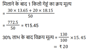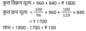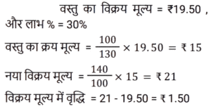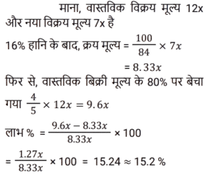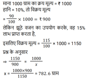 लाभ और हानि Part-2Total Questions: 5021. एक आदमी एक कमीज को 4% हानि पर ₹960 में बेचता है। वह एक स्वेटर को 20% लाभ पर ₹840 में बेचता है। उसका शुद्ध लाभ या हानि ज्ञात कीजिए। [Group D 02/09/2022 ( Afternoon )](a) लाभ, ₹100 (b) हानि, ₹123(c) हानि, ₹100 (d) लाभ, ₹123Correct Answer: (a) लाभ, ₹100 Solution:22. हरीश ने एक वस्तु ₹520 में खरीदी और इसे 30% हानि पर रघु को बेच दिया। इस राशि से हरीश ने एक अन्य वस्तु खरीदी और उसे 55% लाभ पर बेच दिया। हरीश का कुल प्रतिशत लाभ ज्ञात कीजिए। [Group D 02/09/2022 ( Afternoon )](a) 9.5% (b) 8.5%(c) 7.8% (d) 9%Correct Answer: (b) 8.5%Solution:23. किसी वस्तु को ₹19.50 में बेचने पर एक व्यक्ति को 30% लाभ होता है। 40% लाभ प्राप्त करने के लिए विक्रय मूल्य में कितनी वृद्धि की जानी चाहिए? [Group D 02/09/2022 ( Evening )](a) ₹1.50 (b) ₹2.00 (c) ₹4.00 (d) ₹1.90Correct Answer: (a) ₹1.50 Solution:24. एक दुकानदार अपने माल को 10% हानि पर बेचने का दावा करता है, लेकिन गलत तराजू का उपयोग करता है और 15% लाभ प्राप्त करता है। 1 kg के लिए उसके द्वारा उपयोग किया जाने वाला वास्तविक वजन (एक दशमलव स्थान तक) कितना है? [Group D 02/09/2022 ( Evening )](a) 784.4 g (b) 785.6 g (c) 782.6 g(d) 788.4 gCorrect Answer: (c) 782.6 gSolution:25. एक वस्तु को ₹330 में बेचने पर एक व्यक्ति को 12% हानि होती है। यदि वह इसे ₹367.50 में बेचता है, तो उसका प्रतिशत लाभ/हानि ज्ञात कीजिए। [Group D 05/09/2022 ( Afternoon )](a) लाभ 2% (b) हानि 4%(c) लाभ 4% (d) हानि 2%Correct Answer: (d) हानि 2%Solution:26. एक बिक्री के दौरान 66⅔% माल को 26% लाभ पर बेचा जाता है, शेष माल के 25% भाग को 20% लाभ पर बेचा जाता है और इसके बाद शेष बचे माल को 40% हानि पर बेचा जाता है। यदि कुल लाभ x% है, तो x का मान ज्ञात कीजिए। [Group D 06/09/2022 ( Morning )](a) 8.5 (b) 9.5 (c) 9(d) 8Correct Answer: (c) 9Solution:27. एक दुकानदार एक पंखे का सूची मूल्य, उसके क्रय मूल्य से 22% अधिक अंकित करता है और इस अंकित मूल्य पर 15% छूट प्रदान करता है। यदि वह ₹111 का लाभ अर्जित करता है, तो पंखे का सूची मूल्य (₹ में) ज्ञात कीजिए। [Group D 06/09/2022 ( Afternoon )](a) ₹4,200 (b) ₹3,680 (c) ₹3,500 (d) ₹3,660Correct Answer: (d) ₹3,660Solution:28. अरविंद ने एक वस्तु ₹x में खरीदी। उसने इसे 15% हानि पर बीरू को बेच दिया। बीरू ने इसकी ढुलाई पर ₹126 खर्च किए और इसे 25% लाभ पर मोहन को बेच दिया। यदि मोहन ने इसे ₹1,475 में खरीदा, तो ₹x का मान ज्ञात कीजिए। [Group D 06/09/2022 ( Afternoon )](a) ₹1,240 (b) ₹1,160 (c) ₹1,320 (d) ₹1,280Correct Answer: (a) ₹1,240 Solution:29. एक दुकानदार ₹13.65 प्रति kg वाले गेहूँ की 30 kg मात्रा को ₹18.15 प्रति kg वाले गेहूँ की 20 kg मात्रा के साथ मिलाता है। 30% लाभ अर्जित करने के लिए उसे मिश्रित गेहूँ को प्रति kg किस मूल्य पर बेचना चाहिए (निकटतम रुपये में)? [Group D 08/09/2022 ( Afternoon )](a) ₹18 (b) ₹17 (c) ₹20(d) ₹15Correct Answer: (c) ₹20Solution:30. एक वस्तु को उसके मूल विक्रय मूल्य के 7⁄12 पर बेचने पर मानव (Manav) को 16% हानि होती है। यदि वह इसे उसके मूल विक्रय मूल्य के 80% पर बेचता है, तो प्रतिशत लाभ ज्ञात कीजिए। [Group D 08/09/2022 ( Afternoon )](a) 14.5% (b) 14.8% (c) 15.2%(d) 15.5%Correct Answer: (c) 15.2%Solution:Submit Quiz« Previous12345Next »