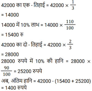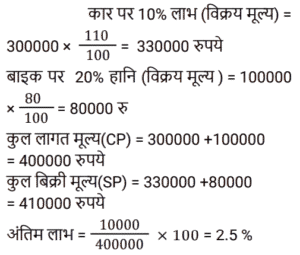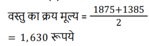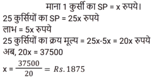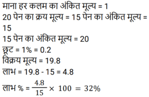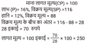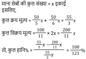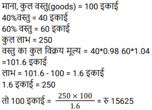 लाभ और हानि Part-6Total Questions: 501. एक महिला मुद्रित मूल्य के 24% छूट पर एक कार खरीदती है और उसे मुद्रित मूल्य से 20% अधिक पर बेचती है। उसका प्रतिशत लाभ क्या है? [RRB NTPC 02/03/2021 (Evening)](a)(b)(c)(d)Correct Answer: (b)Solution:2. एक वस्तु को 1,875 रुपये में बेचे पर अधिक लाभ उतना ही है जितना कि वस्तु को 1,385 रुपये में बेचने पर हुआ नुकसान। वस्तु का क्रय मूल्य (रु में) क्या है? [RRB NTPC 02/03/2021 (Evening)](a) Rs.1,660(b) Rs.1,650(c) Rs.1,360(d) Rs.1,630Correct Answer: (d) Rs.1,630Solution:3. एक आदमी लागत मूल्य की 4% हानि पर फूल बेचता है लेकिन वह माने के लिए 25g वजन के बजाय 20g का उपयोग करता है। उसका प्रतिशत लाभ क्या है? [RRB NTPC 03/03/2021 (Morning)](a) 40%(b) 60%(c) 20%(d) 10%Correct Answer: (c) 20%Solution: 4. एक दुकानदार ने एक निर्मिता से 37,500 रुपये में 25 कुर्सियां खरीदीं और उन्हें 5 कुर्सियों के विक्रय मूल्य के बराबर लाभ पर बेच दिया। तो एक कुर्सी की बिक्री मूल्य क्या है? [RRB NTPC 03/03/2021 (Evening)](a) Rs.1500(b) Rs.1200(c) Rs.1250(d) Rs.1875Correct Answer: (d) Rs.1875Solution:5. एक आदमी ने 50 रुपये में 5 की दर से कुछ सेब खरीदी और सामान संख्या में 50 रुपये में 6 की दर से बेच दिया। यदि वह उन्हें 100 रुपये में 11 की दर से बेचता है, तो उसका प्रतिशत लाभ या हानि क्या होगी? [RRB NTPC 03/03/2021 (Evening)](a) 100/121% हानि(b) 100/121% लाभ(c) 121/100% हानि(d) 121/100% लाभCorrect Answer: (a) 100/121% हानिSolution:6. एक फुटकर विक्रेता एक थोक व्यापारी से 20 कलमों को 15 कलमों के अंकित मूल्य पर खरीदता है। यदि वह इन 20 पेनों को 1% की छूट देकर बेचता है, तो फुटकर विक्रेता का लाभ प्रतिशत कितना है? [RRB NTPC 04/03/2021 (Morning)](a) 35%(b) 25%(c) 32%(d) 30%Correct Answer: (c) 32%Solution:7. राम ने एक कंपनी के शेयरों में 42,000/- रुपये का निवेश किया। उसने कुल शेयरों को एक तिहाई 10% के लाभ पर बेचा, उसने शेष शेयरों को 10% हानि पर बेच दिया। राम को कितना हानि हुआ? [RRB NTPC 04/03/2021 (Evening)](a) Rs. 5,200(b) Rs. 4,200(c) Rs. 1,400(d) Rs. 4,000Correct Answer: (c) Rs. 1,400Solution:8. 40% वस्तुओं को 2% हानि पर बेचा जाता है जबकि शेष वस्तुओं को 4% लाभ पर बेचा जाता है। यदि कुल लाभ 250 रुपये है, तो बेची गई वस्तु का क्रय मूल्य है। [RRB NTPC 05/03/2021 (Morning)](a) 15625(b) 5625(c) 9000(d) 6525Correct Answer: (a) 15625Solution:9. बाबू ने एक कार 300000 रुपये में और एक बाइक अपने बेटे के लिए 100000 रुपये में खरीदी। उसने कार को 10% के लाभ पर और बाइक को 20% की हानि पर बेच दिया। शुद्ध लाभ या हानि क्या है? [RRB NTPC 05/03/2021 (Morning)](a) 2.5% लाभ(b) 2.5% हानि(c) 2% लाभ(d) 1.5% हानिCorrect Answer: (a) 2.5% लाभSolution:10. एक वस्तु को बेचते समय 16% लाभ और 12% हानि के बीच का अंतर 70 रुपये है। वस्तु का लागत मूल्य क्या है? [RRB NTPC 05/03/2021 (Evening)](a) Rs. 240(b) Rs. 225(c) Rs. 250(d) Rs. 235Correct Answer: (c) Rs. 250Solution:Submit Quiz12345Next »