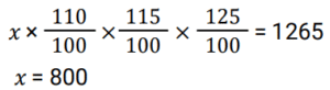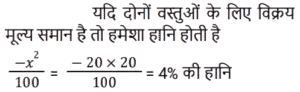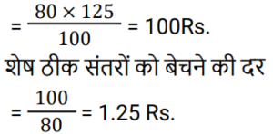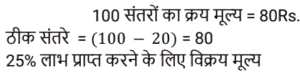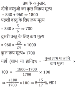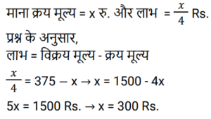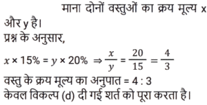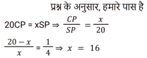 लाभ और हानि Part-7Total Questions: 491. एक फल विक्रेता ने 100 संतरे ₹80 में खरीदे। यदि उनमें से 20 सड़े हुए हैं, तो 25% लाभ कमाने के लिए शेष संतरों को किस मूल्य पर बेचा जाना चाहिए? [RRB JE 27/05/2019 (Evening)](a) ₹1.20(b) ₹1.25(c) ₹1.50(d) ₹1Correct Answer: (b) ₹1.25Solution:2. ₹1265 के खुदरा मूल्य वाली एक मेज की उत्पादन लागत ज्ञात कीजिए, यदि निर्माता को 10% का लाभ होता है, और थोक व्यापारी को 15% का लाभ होता है तथा खुदरा विक्रेता को 25% का लाभ होता है। [RRB JE 28/05/2019 (Morning)](a) ₹900(b) ₹850(c) ₹750(d) ₹800Correct Answer: (d) ₹800Solution:3. एक वस्तु बेचकर, मदन ने उसके क्रय मूल्य के एक-चौथाई के बराबर लाभ अर्जित किया। यदि उसने इसे ₹375 में बेचा, तो क्रय मूल्य क्या था? [RRB JE 29/05/2019 (Morning)](a) ₹312.50(b) ₹350(c) ₹300(d) ₹281.75Correct Answer: (c) ₹300Solution:4. जब किसी वस्तु को 5% के लाभ पर बेचा जाता है तो इसे 5% की हानि पर बेचे जाने की तुलना में ₹15 अधिक प्राप्त होते हैं। इसका क्रय मूल्य ज्ञात कीजिए। [RRB JE 31/05/2019 (Afternoon)](a) ₹300(b) ₹250(c) ₹150(d) ₹200Correct Answer: (c) ₹150Solution:5. ₹150000 मूल्य का एक घर X ने Y को 5% लाभ पर बेचा। यदि Y, 2% हानि के साथ यह घर X को वापिस बेच देता है, तो पूरे लेनदेन में क्या होता है? [RRB JE 31/05/2019 (Evening)](a) X को ₹3150 का लाभ होता है।(b) X को ₹4350 की हानि होती है।(c) X को ₹1350 की हानि होती है।(d) X को ₹4350 का लाभ होता है।Correct Answer: (a) X को ₹3150 का लाभ होता है।Solution:6. दो वस्तुओं को ₹840 और ₹960 में बेचा जाता है जिन पर क्रमशः 20% लाभ और 4% की हानि होती है। कुल लाभ या हानि प्रतिशत ज्ञात करें। [RRB JE 01/06/2019 (Afternoon)] (a) 5⁵⁄₁₇% लाभ(b) 5¹⁵⁄₁₆% लाभ(c) 5¹⁵⁄₁₇% हानि(d) 5⁵⁄₁₇% हानिCorrect Answer: (b) 5¹⁵⁄₁₆% लाभSolution:7. दो वस्तुओं जिनमें प्रत्येक का क्रय मूल्य ₹2500 है। एक को 5% लाभ पर बेचा जाता है। यदि कुल मिलाकर 20% का लाभ हुआ हो, तो अन्य दूसरी वस्तुओं की बिक्री पर हुआ प्रतिशत लाभ ज्ञात कीजिए। [RRB JE 01/06/2019 (Evening)](a) 20%(b) 30%(c) 25%(d) 35%Correct Answer: (d) 35%Solution:8. रवि ने दो साइकिल समान मूल्य पर बेची, लेकिन उसे एक साइकिल पर 20% का लाभ हुआ और दूसरी साइकिल पर 20% की हानि हुई। इस लेनदेन में हुई उसकी लाभ या हानि ज्ञात कीजिए। [RRB JE 01/06/2019 (Evening)](a) 20% की हानि(b) 4% की हानि(c) 10% का लाभ(d) 20% का लाभCorrect Answer: (b) 4% की हानिSolution:9. एक वस्तु पर दी गई 15% की छूट दूसरी वस्तु पर दी गई 20% छूट के बराबर। दोनों वस्तुओं की कीमत का पता लगाएं। [RRB JE 02/06/2019 (Morning)](a) ₹60, ₹40(b) ₹40, ₹20(c) ₹70, ₹50(d) ₹80, ₹60Correct Answer: (d) ₹80, ₹60Solution:10. 20 मेजों का क्रय मूल्य 'x' मेजों के विक्रय मूल्य के बराबर है। यदि इसमें 25% का लाभ होता हो, तो x का मान ज्ञात कीजिए | [RRB JE 02/06/2019 (Morning)](a) 18(b) 16(c) 25(d) 15Correct Answer: (b) 16Solution:Submit Quiz12345Next »