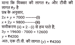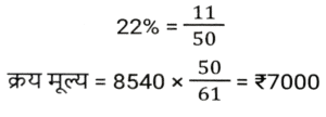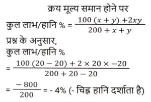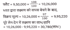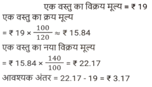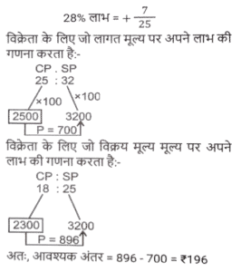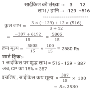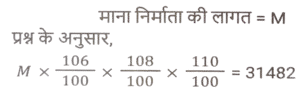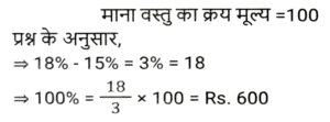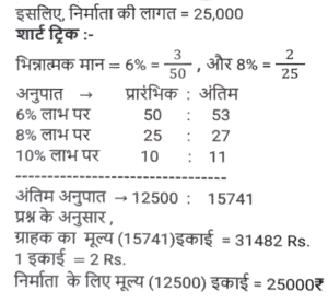 लाभ और हानि (SSC) (Part-II)Total Questions: 5011. एक साईकिल विक्रेता 516 प्रति साईकिल के लाभ पर 12 साइकिलों और 129 प्रति साईकिल के नुकसान पर 3 साइकिले बेचता है। बिक्री की गयी सभी साइकिलों पर यदि कुल लाभ प्रतिशित 15% है तो प्रति साईकिल का मूल्य क्या होगा ? [SSC CPO 14/03/2019 (Evening)](a) 2960(b) 3870(c) 2580(d) 4440Correct Answer: (c) 2580Solution:12. एक निर्माता थोक व्यापारी को 6% लाभ पर वस्तु बेचता है। थोक व्यापारी इसे खुदरा व्यापारी को 8% लाभ पर बेचता है तथा खुदरा व्यापारी इसे ग्राहक को 10% लाभ पर बेच देता है। ग्राहक के द्वारा दी गयी कीमत 31,482 रुपये है, तो निर्माता के लिए इस उत्पाद की कीमत क्या होगी ? [SSC CPO 14/03/2019 (Morning)](a) 28,306(b) 26,524(c) 25,000(d) 26,980Correct Answer: (c) 25,000Solution:13. संदीप एक ओवरकोट को ₹8,540 में बेचकर 22% लाभ अर्जित करता है। ओवरकोट का क्रय मूल्य ज्ञात कीजिए। [SSC CHSL Tier II (18/11/2024)](a) ₹ 7,500(b) ₹ 7,000(c) ₹ 6,000(d) ₹ 6,500Correct Answer: (b) ₹ 7,000Solution:14. अतुल ने ₹19,200 प्रति बोरी की दर से दो बोरी चावल बेचे। एक पर उसे 20% का लाभ हुआ और दूसरे पर उसे 20% की हानि हुई। पूरे सौदे में उसका लाभ या हानि प्रतिशत ज्ञात करें। [SSC MTS 30/09/2024 (Morning)](a) 8% लाभ(b) 7% लाभ(c) 4% हानि(d) 5% हानिCorrect Answer: (c) 4% हानिSolution:15. दो मिक्सर और एक टीवी की कीमत ₹7,000 है, जबकि दो टीवी और एक मिक्सर की कीमत ₹9,800 है। एक टीवी की कीमत कितनी होगी ? [SSC MTS 01/10/2024 (Morning)](a) ₹3,600(b) ₹4,600(c) ₹3,200(d) ₹4,200Correct Answer: (d) ₹4,200Solution:16. एक दुकानदार बिक्री पर 15% का लाभ कमाता है। यदि वह इसे Rs.18 अधिक में बेचता, तो वह 18% का लाभ कमाता। वस्तु का क्रय मूल्य __________ है। [SSC MTS 01/10/2024 (Afternoon)](a) Rs.650(b) Rs.550(c) Rs.600(d) Rs.500Correct Answer: (c) Rs.600Solution:17. ₹19 में एक वस्तु को बेचकर, एक विक्रेता 20% का लाभ अर्जित करता है। उसे अपना विक्रय मूल्य (₹ में, दो दशमलव स्थान तक सन्निकटित) कितना बढ़ाना चाहिए, ताकि 40% का लाभ अर्जित कर सके ? [SSC MTS 01/10/2024 (Afternoon)](a) 6.17(b) 3.17(c) 4.17(d) 5.17Correct Answer: (b) 3.17Solution:18. एक विक्रेता दूध में पानी मिलाकर और इस मिश्रण को क्रय मूल्य पर बेचकर 25% लाभ प्राप्त करना चाहता है। मिश्रण में पानी और दूध का अनुपात ज्ञात करें। [SSC MTS 07/10/2024 (Morning)](a) 2 : 5(b) 1 : 4(c) 2 : 7(d) 1 : 5Correct Answer: (b) 1 : 4Solution:19. लक्ष्मण द्वारा भरत को ₹9,50,000 का एक फ्लैट 8% लाभ पर बेचा जाता है। यदि भरत इसे वापस लक्ष्मण को 3% हानि पर बेचता है, तो पूरे लेन-देन में लक्ष्मण का लाभ हानि (₹ में) ज्ञात कीजिए ? [SSC MTS 08/10/2024 (Morning)](a) लक्ष्मण को ₹30,780 का लाभ(b) लक्ष्मण को ₹50,200 का लाभ(c) लक्ष्मण को ₹45,220 का लाभ(d) लक्ष्मण को ₹45,220 की हानिCorrect Answer: (a) लक्ष्मण को ₹30,780 का लाभSolution:20. दो विक्रेता क्रमशः क्रय मूल्य और विक्रय मूल्य पर अपने प्रतिशत लाभ की गणना करते हैं। यदि दोनों विक्रेता ₹3,200 में बेचे गए माल पर 28% के लाभ की घोषणा करते हैं, तो लाभों के बीच का अंतर (₹ में) ज्ञात करें। [SSC MTS 09/10/2024 (Morning)](a) 196(b) 700(c) 548(d) 896Correct Answer: (a) 196Solution:Submit Quiz« Previous12345Next »