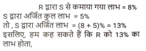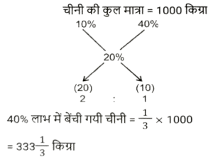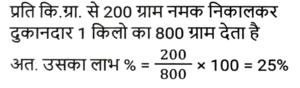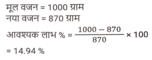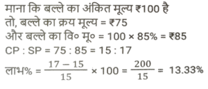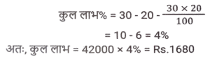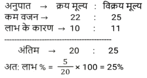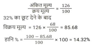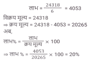 लाभ और हानि (SSC) (Part-II)Total Questions: 5031. एक पंसारी लागत मूल्य पर चावल बेचने का दावा करता है, लेकिन 1 kg के लिए 870 g के नकली वजन का उपयोग करता है। उसका लाभप्रतिशत (दो दशमलव स्थानों तक सही) ज्ञात कीजिए। [SSC CGL 09/09/2024 (1st Shift)](a) 15.11%(b) 14.94%(c) 18.21%(d) 11.11%Correct Answer: (b) 14.94%Solution:32. माधव ने ₹42,000 में एक वस्तु खरीदी और उसे 20% की हानि पर बेच दिया। उस राशि से उसने एक और वस्तु खरीदी और उसे 30% के लाभ पर बेच दिया। कुल लाभ (₹ में) कितना है? [SSC CGL 09/09/2024 (2nd Shift)](a) 6720(b) 4200(c) 1680(d) 2520Correct Answer: (c) 1680Solution:33. एक वस्तु का अंकित मूल्य उसके क्रय मूल्य से 26% अधिक है। यदि 32% की छूट दी जाती है, तो हानि प्रतिशत क्या होगा? [SSC CGL 09/09/2024 (2nd Shift)](a) 18.64%(b) 15.25%(c) 12.26%(d) 14.32%Correct Answer: (d) 14.32%Solution:34. एक बेईमान दुकानदार ₹25/ kg की दर से नमक बेचने का दावा करता है। नमक का क्रय मूल्य ₹ 25/ kg है। इससे संतुष्ट नहीं होने पर वह प्रत्येक kg से 200 gm निकालकर मुनाफा कमाने की कोशिश करता है। दुकानदार का लाभप्रतिशत कितना है? [SSC CGL 09/09/2024 (3rd Shift)](a) 15%(b) 25%(c) 30%(d) 20%Correct Answer: (b) 25%Solution:35. एक व्यापारी के पास 1000 kg चीनी है, जिसका एक भाग वह 10% लाभ पर और शेष 40% लाभ पर बेचता है। उसे पूरे सौदे में 20% का लाभ होता है। 40% लाभ पर बेची गई मात्रा की गणना करें। [SSC CGL 10/09/2024 (2nd Shift)](a) 543⅓ kg(b) 383⅓ kg(c) 333⅓ kg(d) 443⅓ kgCorrect Answer: (c) 333⅓ kgSolution:36. रवि के वेतन में 50% की वृद्धि की गई। कुछ समय बाद उसके नए वेतन में भी 50% की वृद्धि कर दी गई। उसके वेतन का लाभ-प्रतिशत ज्ञात कीजिए। [SSC CGL 10/09/2024 (2nd Shift)](a) 125%(b) 100%(c) 200%(d) 150%Correct Answer: (a) 125%Solution:37. एक बेईमान व्यापारी अपने किराने का सामान वास्तविक बांट से 12% कम बांट का उपयोग करके बेचता है और 10% का लाभअर्जित करता है। उसका कुल लाभ प्रतिशत ज्ञात करें। [SSC CGL 11/09/2024 (1st Shift)](a) 25%(b) 20%(c) 15%(d) 10%Correct Answer: (a) 25%Solution:38. S ने R से कुछ राशि उधार ली और उसे 8% ब्याज देने का वादा किया। फिर S ने उधार ली गई राशि को एक योजना में निवेश किया, जिससे उसने ब्याज समेत R के मूलधन का भुगतान करने के बाद 5% का लाभ अर्जित किया। यदि R ने सीधे ऐसी योजना में निवेश किया होता, तो उसको कितने प्रतिशत लाभ होता? [SSC CGL 11/09/2024 (2nd Shift)](a) 13.4%(b) 13%(c) 14.4%(d) 14%Correct Answer: (b) 13%Solution:39. एक बल्ले का क्रय मूल्य उसके अंकित मूल्य का 75% है। 15% की छूट देने के बाद लाभप्रतिशत की गणना करें। [SSC CGL 11/09/2024 (2nd Shift)](a) 25.6%(b) 13.33%(c) 18.16%(d) 21.33%Correct Answer: (b) 13.33%Solution:40. सिद्धि अपने स्कूटर को ₹24318 में बेचकर, विक्रय मूल्य के 1/6 भाग के बराबर लाभ अर्जित करती है। उसका लाभ प्रतिशत ज्ञात कीजिए। [SSC CGL 12/09/2024 (2nd Shift)](a) 20%(b) 35%(c) 25%(d) 5%Correct Answer: (a) 20%Solution:Submit Quiz« Previous12345Next »