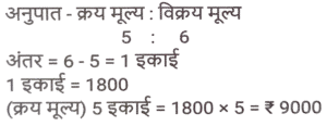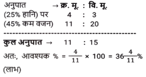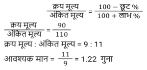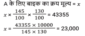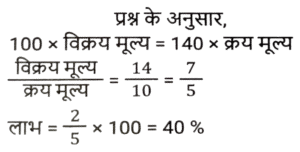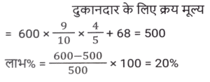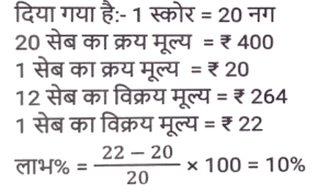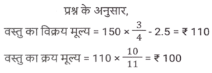 लाभ और हानि (SSC) (Part-III)Total Questions: 5011. रवि अपने माल को क्रय मूल्य पर 25% की हानि पर बेचता है लेकिन 45% कम भार का उपयोग करता है। उसका लाभ या हानि प्रतिशत क्या है? [SSC CHSL 01/07/2024 (2nd Shift)](a) हानि, 47⁹⁄₁₀%(b) हानि, 36⁴⁄₁₁%(c) लाभ, 36⁴⁄₁₁%(d) लाभ, 47⁹⁄₁₀%Correct Answer: (c) लाभ, 36⁴⁄₁₁%Solution:12. एक दुकानदार 10% की छूट देता है और फिर भी 10% का लाभ अर्जित करता है। वस्तु का अंकित मूल्य, वस्तु के क्रय मूल्य का कितना गुना (दशमलव के 2 स्थानों तक सही) है? [SSC CHSL 01/07/2024 (3rd Shift)](a) 1.28(b) 1.20(c) 1.22(d) 1.24Correct Answer: (c) 1.22Solution:13. यदि 100 कलमों का विक्रय मूल्य, 140 कलमों के क्रय मूल्य के बराबर है, तो लाभप्रतिशत ज्ञात कीजिए। [SSC CHSL 01/07/2024 (3rd Shift)](a) 30%(b) 40%(c) 45%(d) 36%Correct Answer: (b) 40%Solution:14. एक व्यापारी प्रत्येक ₹10,000 में दो रेफ्रिजरेटर बेचता है। एक रेफ्रिजरेटर पर उसे 20% की हानि होती है और दूसरे पर उसे 20% का लाभ होता है। पूरे लेन-देन में उसका लाभहानि प्रतिशत क्या था? [SSC CHSL 02/07/2024 (1st Shift)](a) 2% का लाभ(b) 2% की हानि(c) 4% की हानि(d) 4% का लाभCorrect Answer: (c) 4% की हानिSolution:15. एक दुकानदार एक वस्तु पर ₹150 मूल्य अंकित करता है और उसे 25% की छूट पर बेचता है। साथ ही वह वस्तु की खरीद पर ₹2.5 का गिफ्ट भी देता है। यदि वह फिर भी 10% का लाभअर्जित करता है, तो वस्तु का क्रय मूल्य (₹ में) क्या है? [SSC CHSL 02/07/2024 (3rd Shift)](a) 175(b) 100(c) 125(d) 112Correct Answer: (b) 100Solution:16. एक दुकानदार ने ₹115.20 में 288 संतरे खरीदे। उसने उनमें से 50 को 70 पैसे प्रति संतरे की दर से और शेष ₹46.20 में बेच दिए। उसका लाभ या हानि ज्ञात कीजिए। [SSC CHSL 02/07/2024 (3rd Shift)](a) ₹36 की हानि(b) ₹34 की हानि(c) ₹37 का लाभ(d) ₹25 का लाभCorrect Answer: (b) ₹34 की हानिSolution:50 संतरो का विक्रय मूल्य = 50 × 0.7 = ₹ 35 शेष संतरो का विक्रय मूल्य = 46.20 कुल विक्रय मूल्य = 35 + 46.20 = 81.2 हानि = 115.20 - 81.2 = ₹3417. एक वस्तु के क्रय मूल्य और विक्रय मूल्य के बीच का अंतर ₹1,800 है। यदि 20% का लाभ होता है, तो वस्तु का क्रय मूल्य क्या है? [SSC CHSL 02/07/2024 (4th Shift)](a) ₹7,000(b) ₹11,000(c) ₹8,000(d) ₹9,000Correct Answer: (d) ₹9,000Solution:18. एक खुदरा फल विक्रेता ₹400 में एक स्कोर सेब खरीदता है और एक दर्जन सेब ₹264 में बेचता है। उसका हानि/लाभ प्रतिशत क्या था ? (एक स्कोर = 20 नग) [SSC CHSL 03/07/2024 (1st Shift)](a) 20% लाभ(b) 5% हानि(c) 10% हानि(d) 10% लाभCorrect Answer: (d) 10% लाभSolution:19. एक वस्तु का अंकित मूल्य ₹600 है। एक दुकानदार ने इसे 10% और 20% की दो क्रमागत छूटों पर खरीदा। उसने परिवहन पर ₹68 खर्च किए और वस्तु को ₹600 में बेच दिया। उसका लाभ या हानि प्रतिशत ज्ञात कीजिए। [SSC CHSL 03/07/2024 (1st Shift)](a) 15% लाभ(b) 20% लाभ(c) 18% हानि(d) 25% हानिCorrect Answer: (b) 20% लाभSolution:20. A, B को 45% लाभ पर एक बाइक बेचता है। फिर B इसे C को 30% लाभ पर बेच देता है। यदि C, ₹43,355 का भुगतान करता है, तो A के लिए बाइक का क्रय मूल्य ज्ञात है? [SSC CHSL 03/07/2024 (2nd Shift)](a) ₹21,000(b) ₹23,000(c) ₹27,000(d) ₹29,000Correct Answer: (b) ₹23,000Solution:Submit Quiz« Previous12345Next »